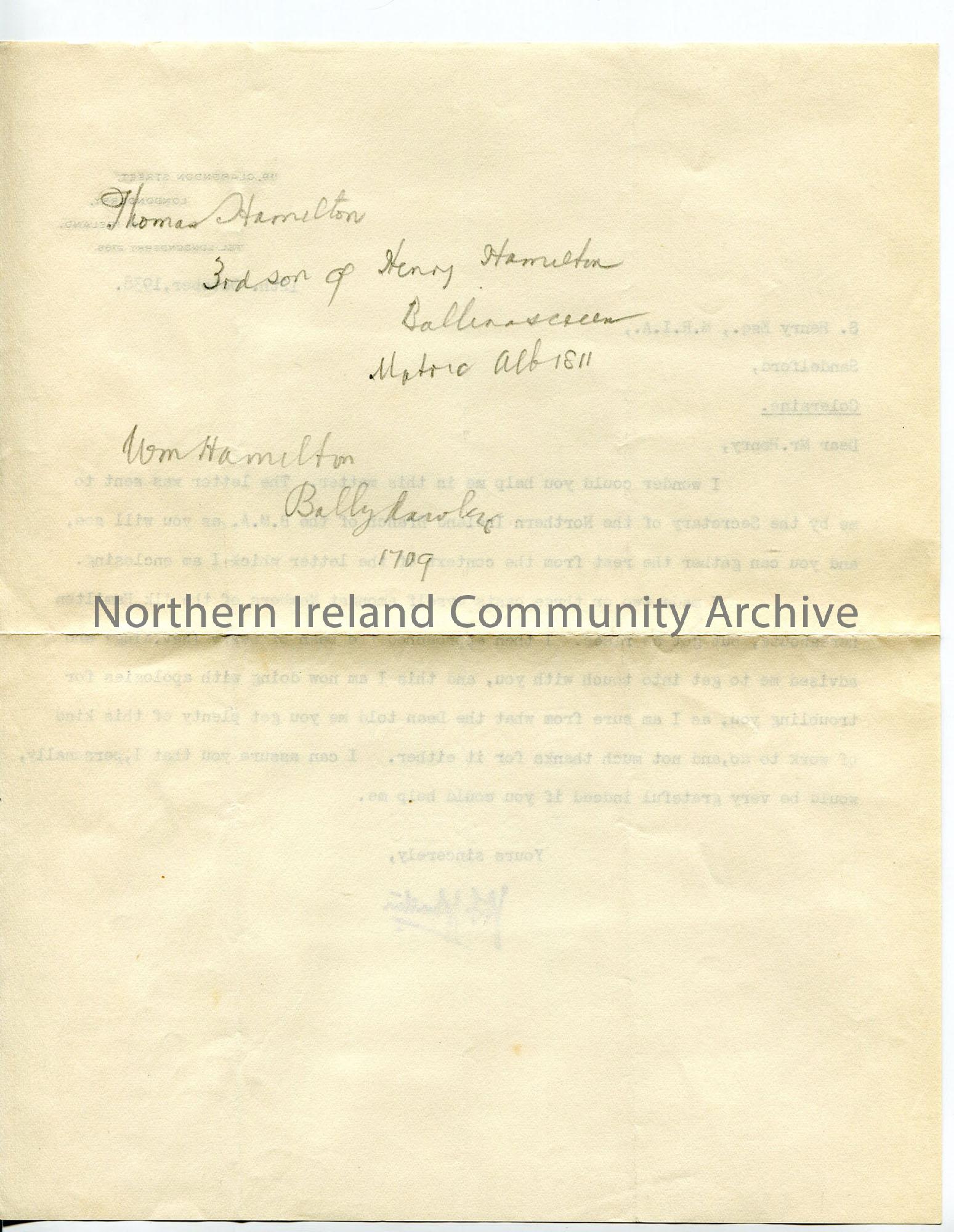 Typed letter asking for help with Hamilton research - Sam recommended to author by Dean of Derry, Rev King. Handwritten brief notes re Hamiltons on reverse.