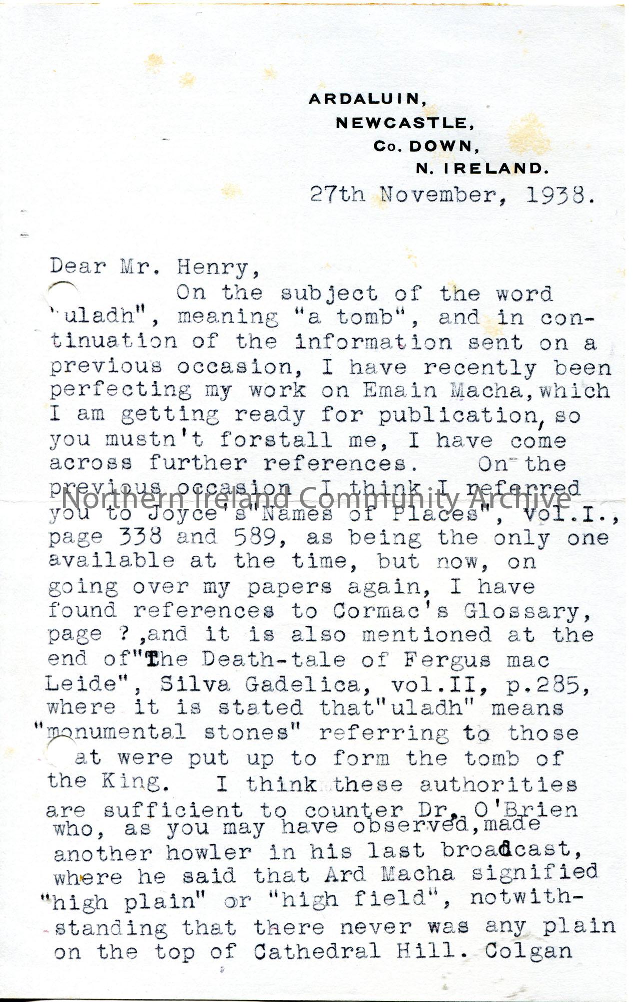 Typed letter (blue paper) to Sam Henry. Discusses the meaning of the term 'Uladh'. They are currently working on a publication re Emain Macha.