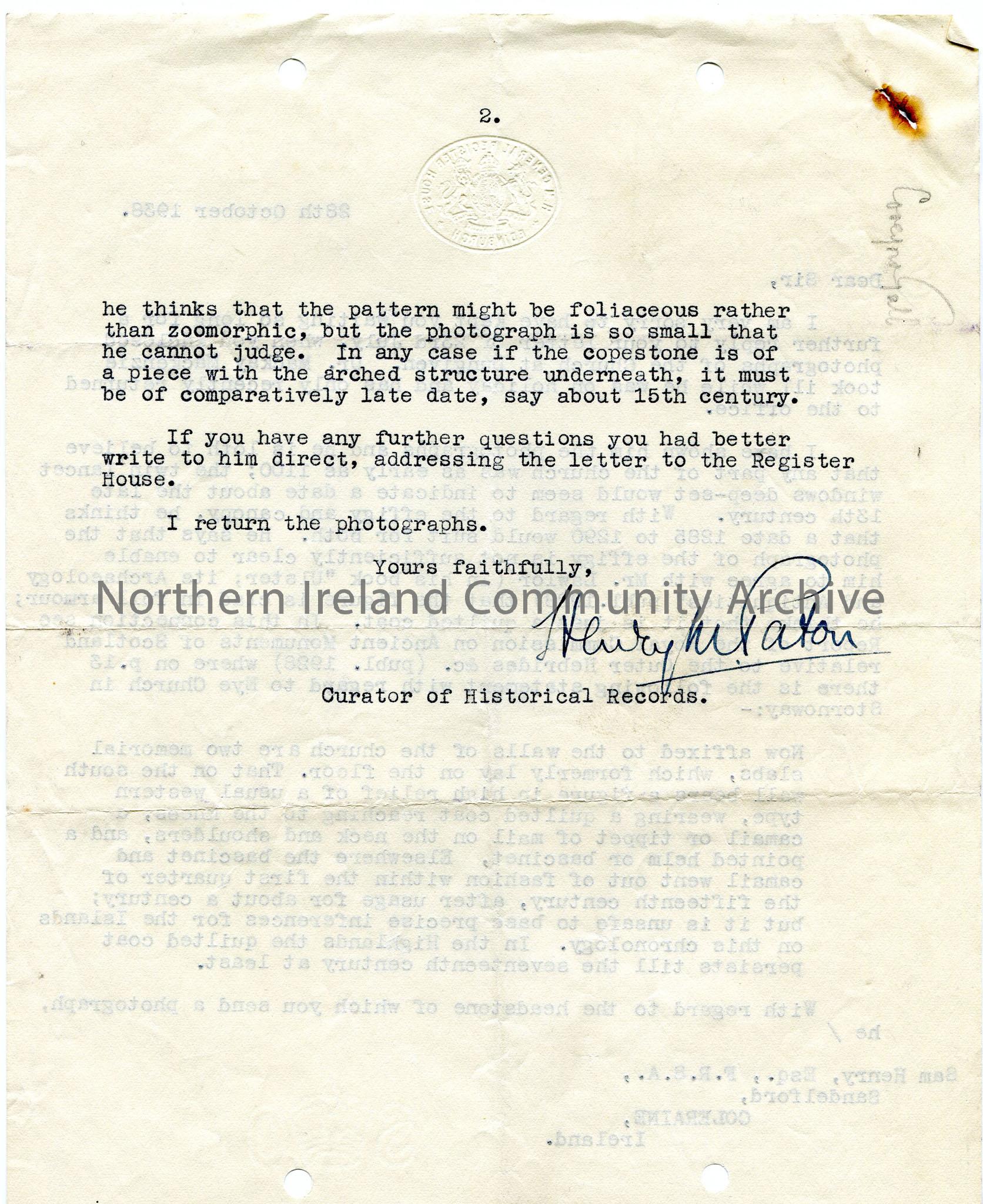 Typed letter, both sides, to Sam Henry re photo of Dungiven Church sent to General Register House, Edinburgh for opinion on date of church – mentions … – img386