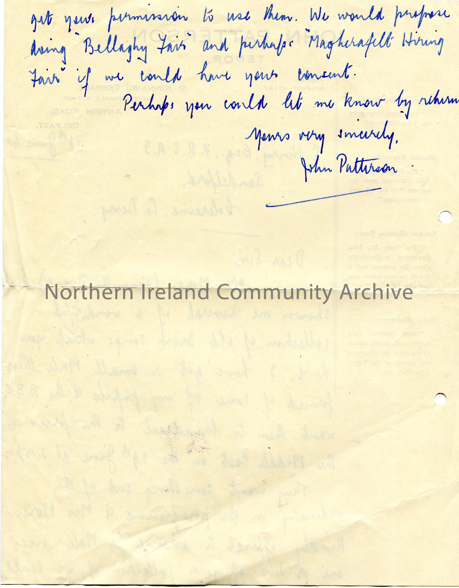 Typed letter, double sided, from john Patterson, Tenor. Dated 16th June, 1943. Writes he has been shown several Irish songs by Mrs Moran (Henrietta Byrne). BBC want some of his pupils to broadcast in the Middle East on 29th June at 7.15pm. Seeking permission from Sam to use one or two of his songs- 'Bellaghy Fair' and 'Magherafelt Hiring Fair'.