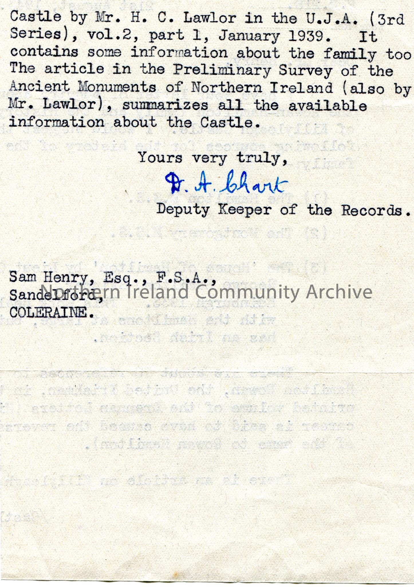Typed letter, double sided, on headed paper to Mr Sam Henry, at Sandelford, Coleraine. Responding to Sam's enquiry re Rowan-Hamilton family and history of Killyleagh Castle. Gives suggestions for sources on the history of the family and Killyleagh Castle.