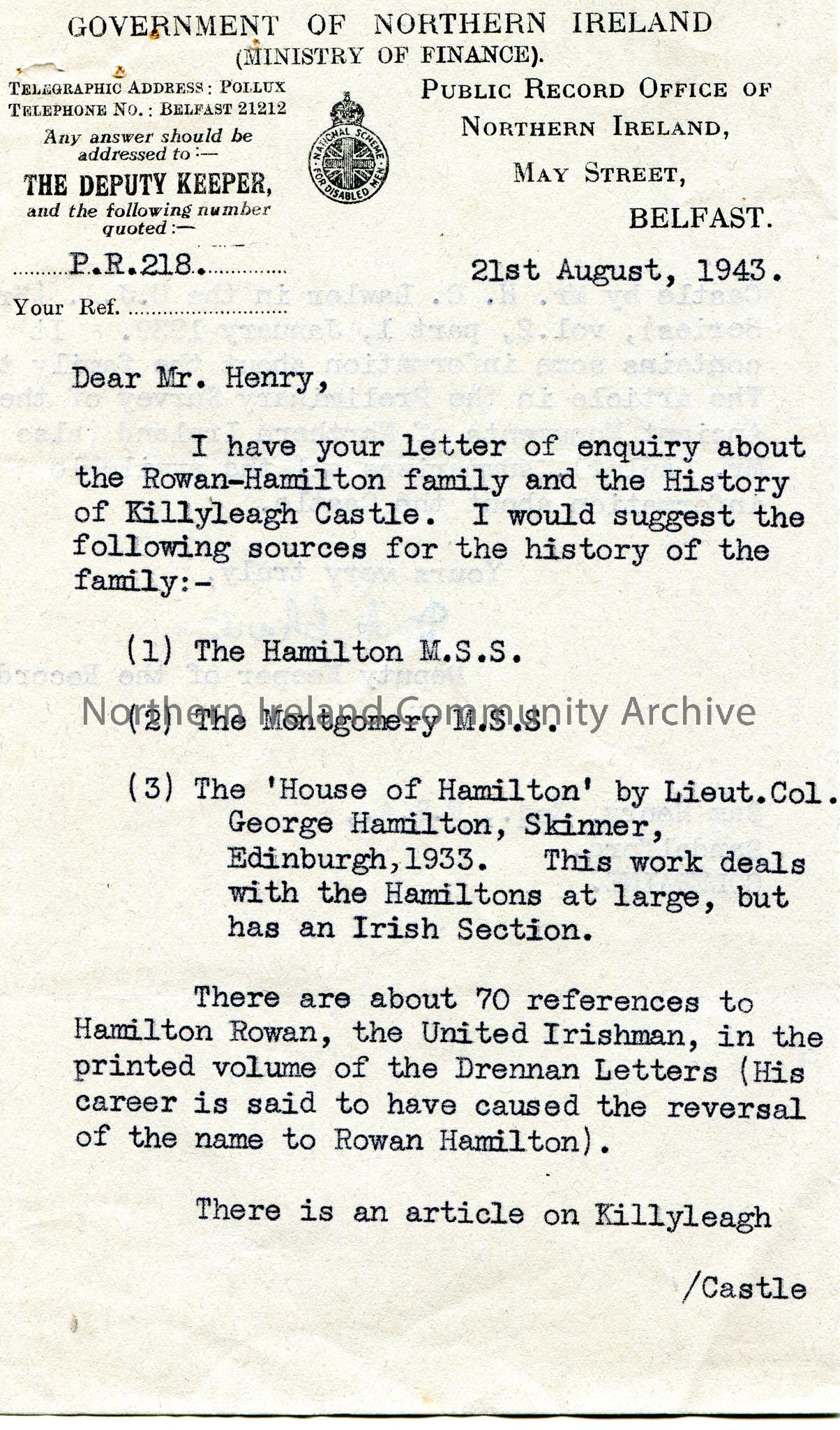 Typed letter, double sided, on headed paper to Mr Sam Henry, at Sandelford, Coleraine. Responding to Sam's enquiry re Rowan-Hamilton family and history of Killyleagh Castle. Gives suggestions for sources on the history of the family and Killyleagh Castle.