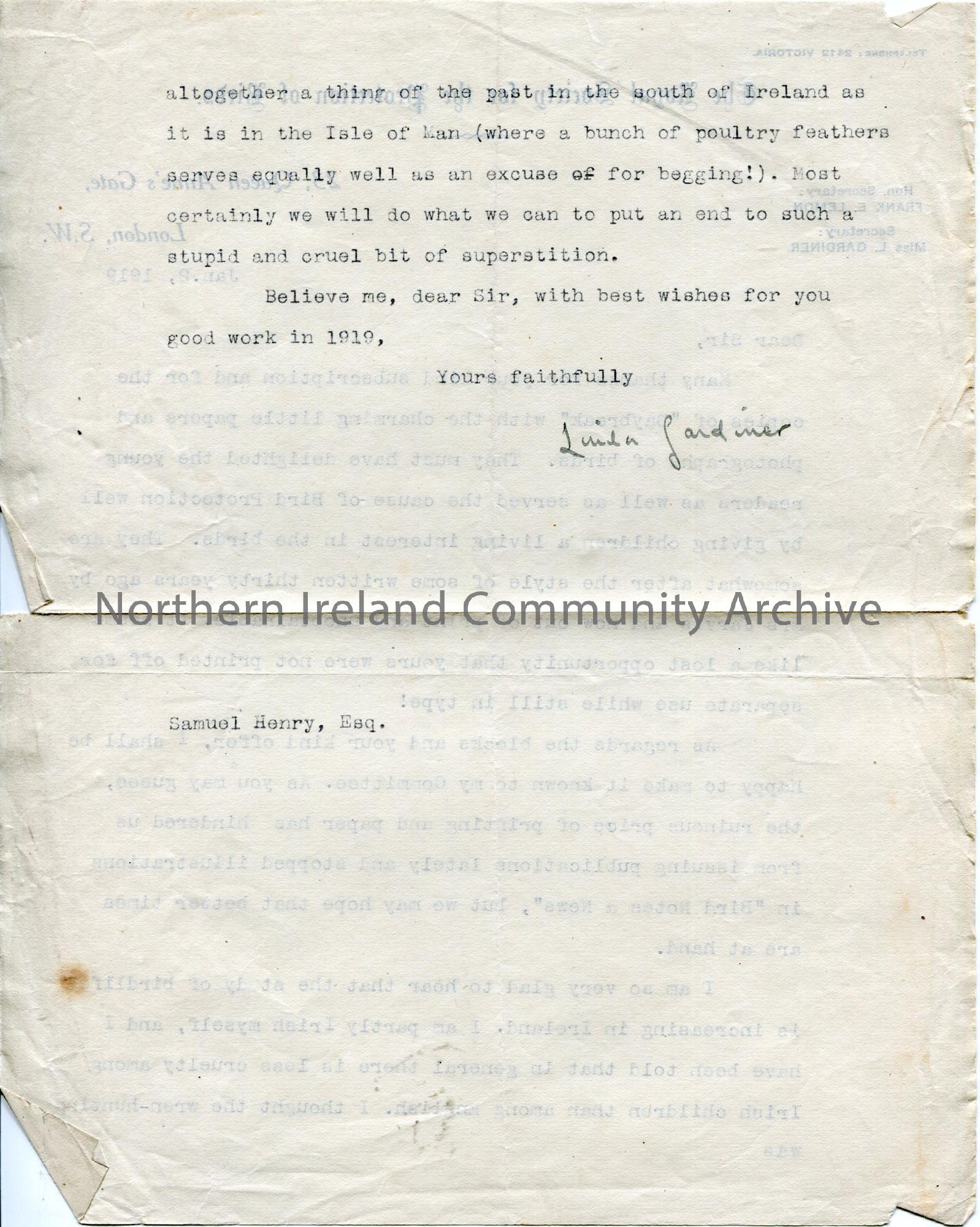 Typed letter (double sided) on headed paper to Sam Henry from the RSPB. Thanks Sam for copies of 'Daybreak' aimed at young people. RSPB had to stop production of 'Bird Notes & News' due to high costs of printing and paper. Discusses the 'wren-hunting' superstition in the south of Ireland and Isle of Man.