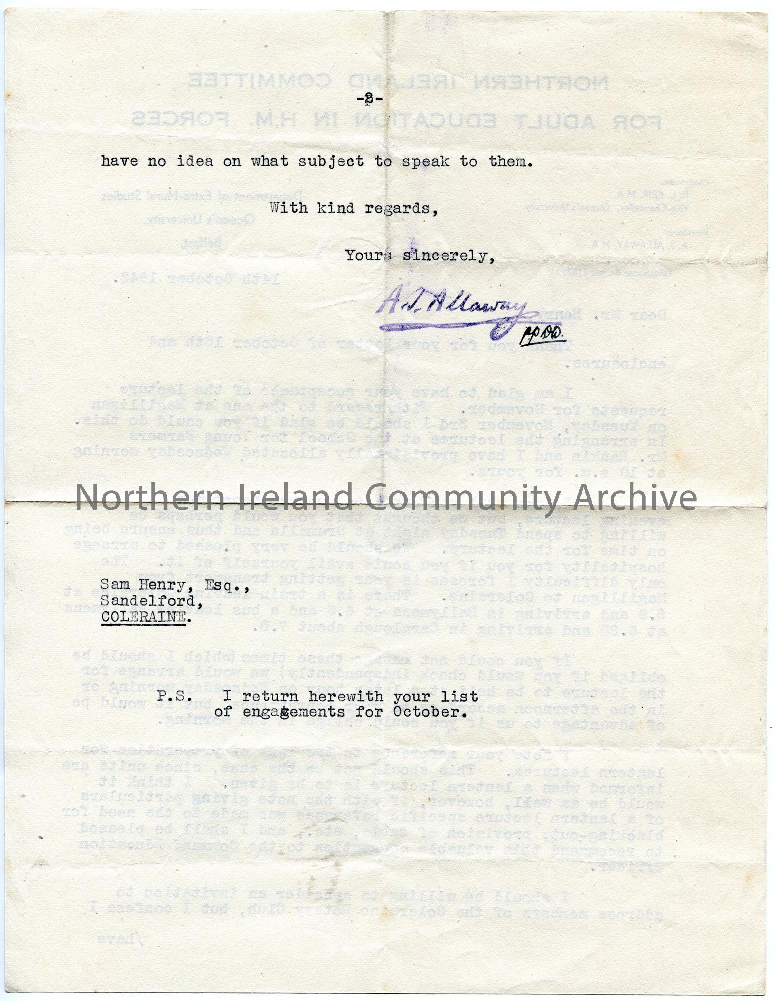 Typed letter (double sided) on headed paper to Sam Henry re lectures. Discusses transport arrangements and lantern arrangements. Writes that he would consider specking to members of Coleraine Rotary Club, but is unsure what subject.