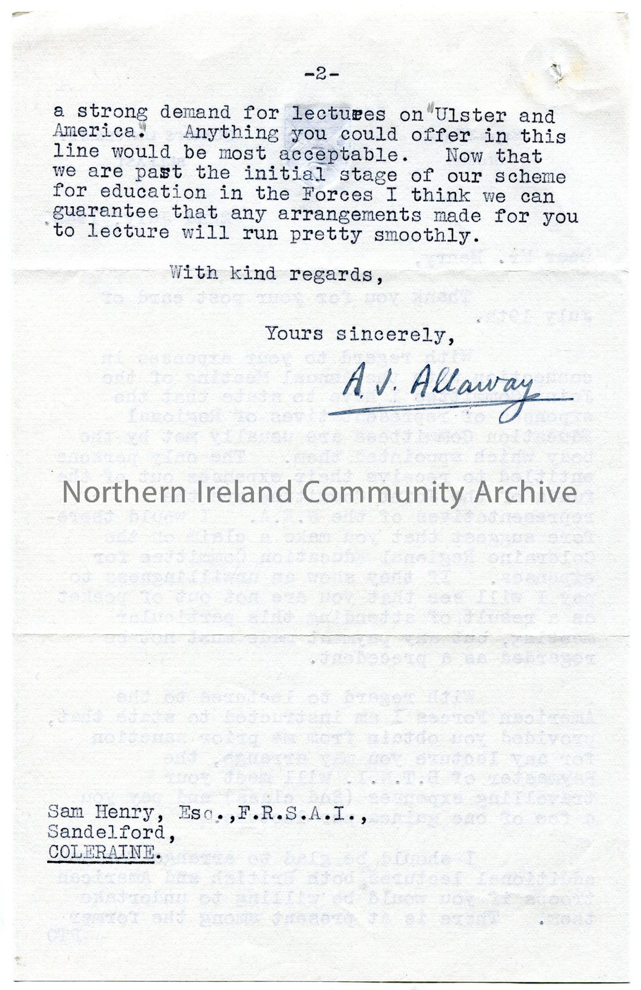 Typed letter (double sided) on headed paper to Sam Henry. Re lectures to American Forces. Informs Sam that expenses claims are to be made to Coleraine… – scan059b