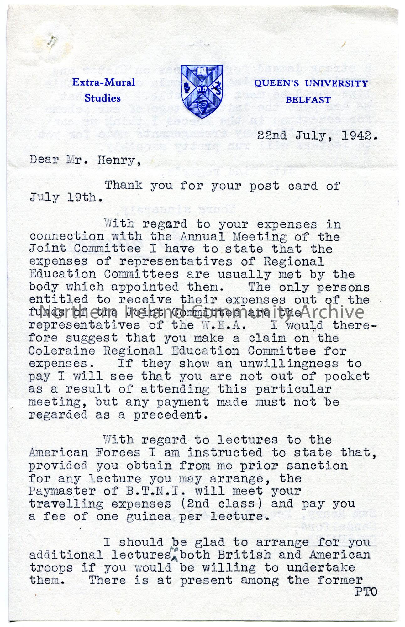 Typed letter (double sided) on headed paper to Sam Henry. Re lectures to American Forces. Informs Sam that expenses claims are to be made to Coleraine Regional Education Committee. Confirms one guinea to be paid per lecture for use of transport. Asks Sam if he wishes to undertake lectures to both British and American troops.