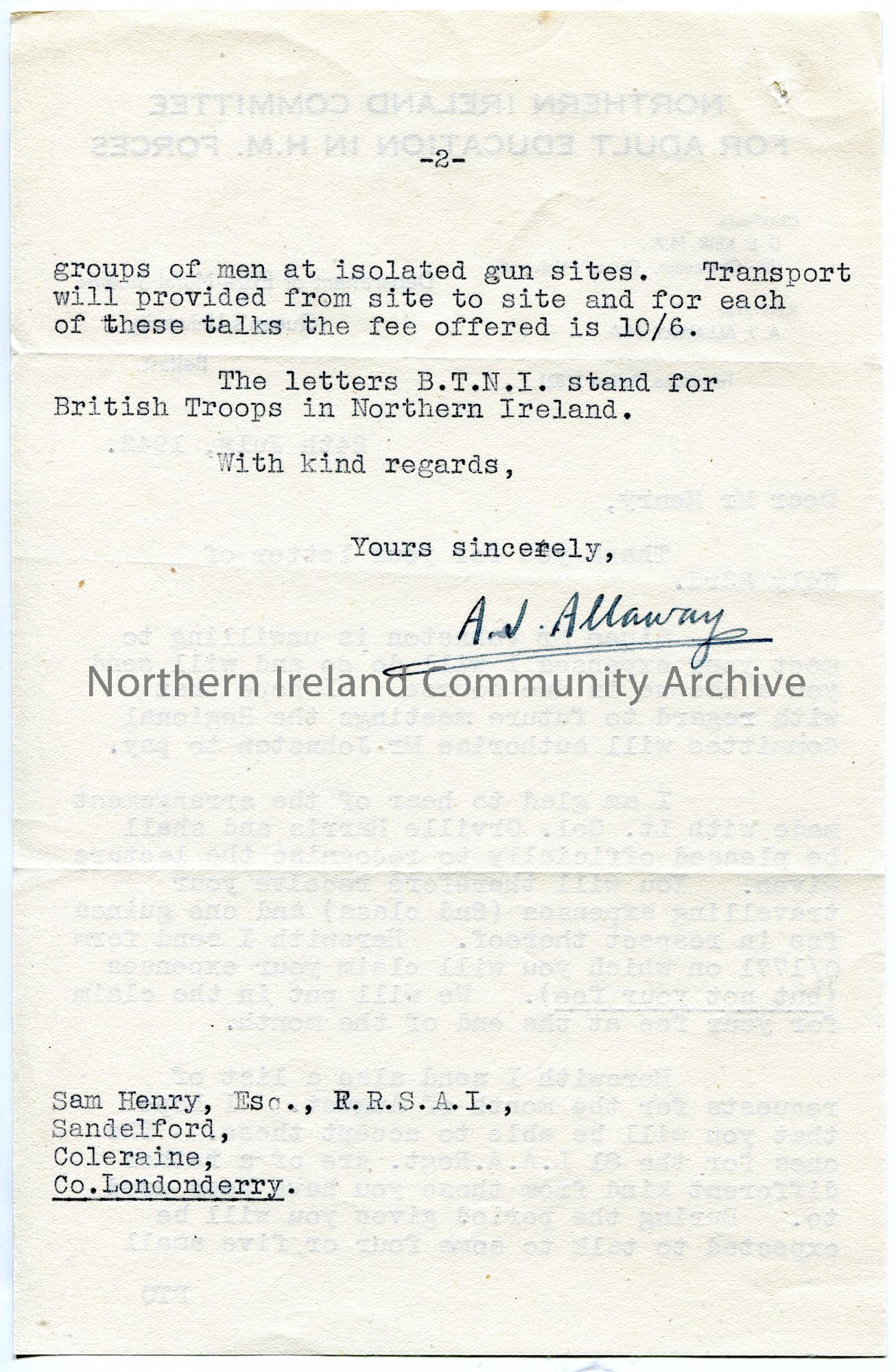 Typed letter (double sided) on headed paper to Sam Henry. Re lectures to American Forces. They are glad of an arrangement with Lt. Col. Orville Harris… – scan060b