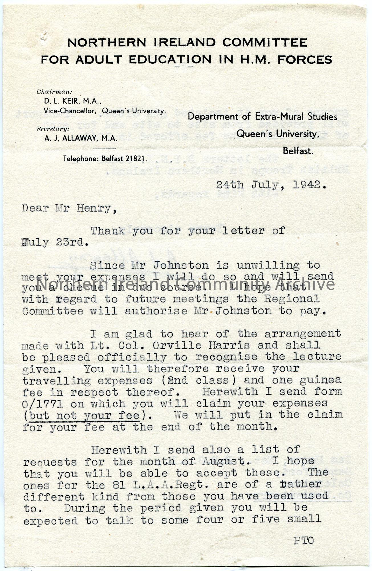 Typed letter (double sided) on headed paper to Sam Henry. Re lectures to American Forces. They are glad of an arrangement with Lt. Col. Orville Harris for a lecture and confirms travelling expenses for this. Encloses list of proposed lectures for August 1942. Tells Sam that some of them will be at isolated gun sites and confirms transport for them.