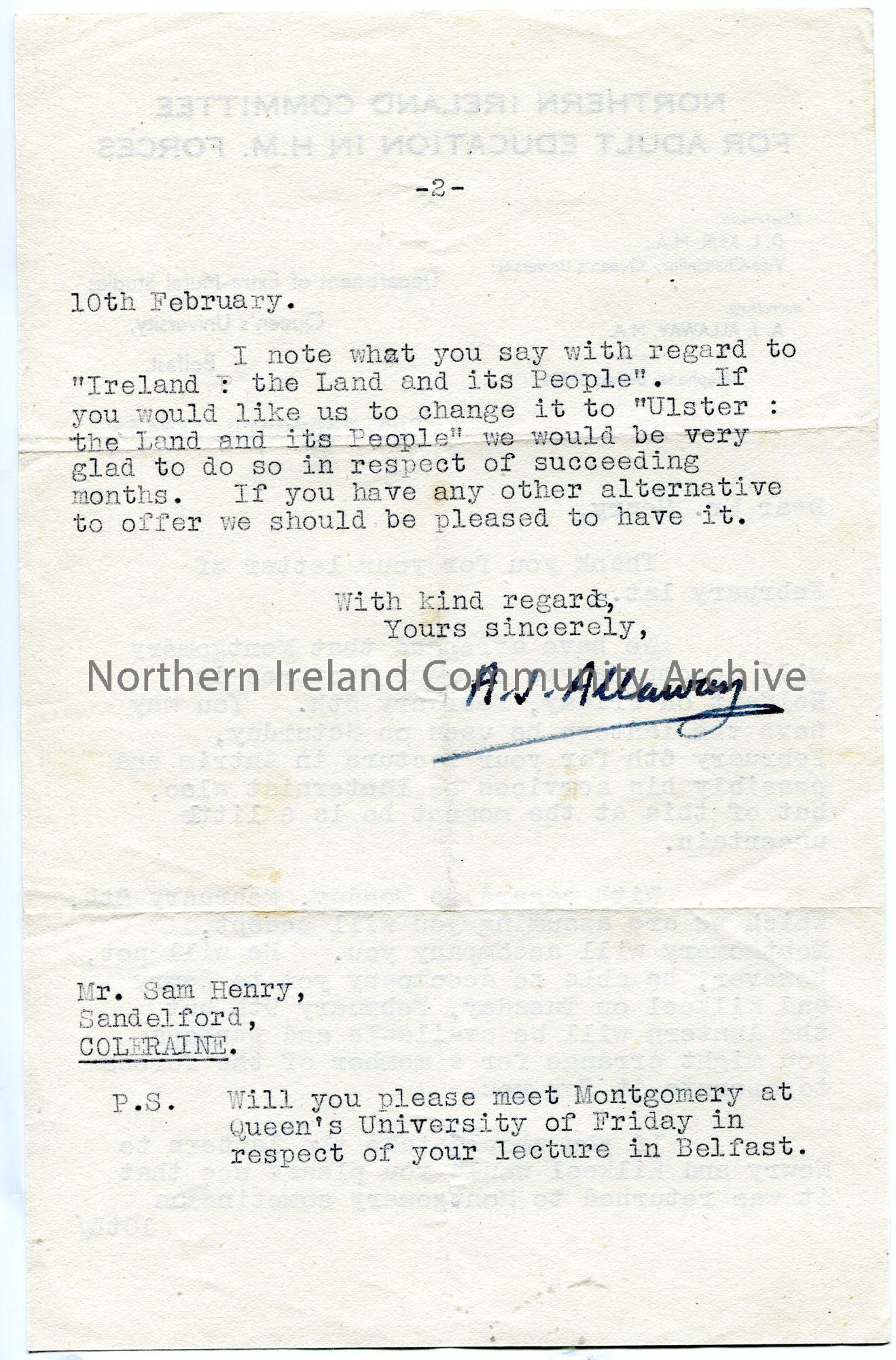 Typed letter (double sided) on headed paper to Sam Henry re lectures to troops. Discusses lantern arrangements for upcoming lectures. Sam had queried the title of the lecture 'Ireland - the Land and its People' and appears to want to change Ireland to Ulster.