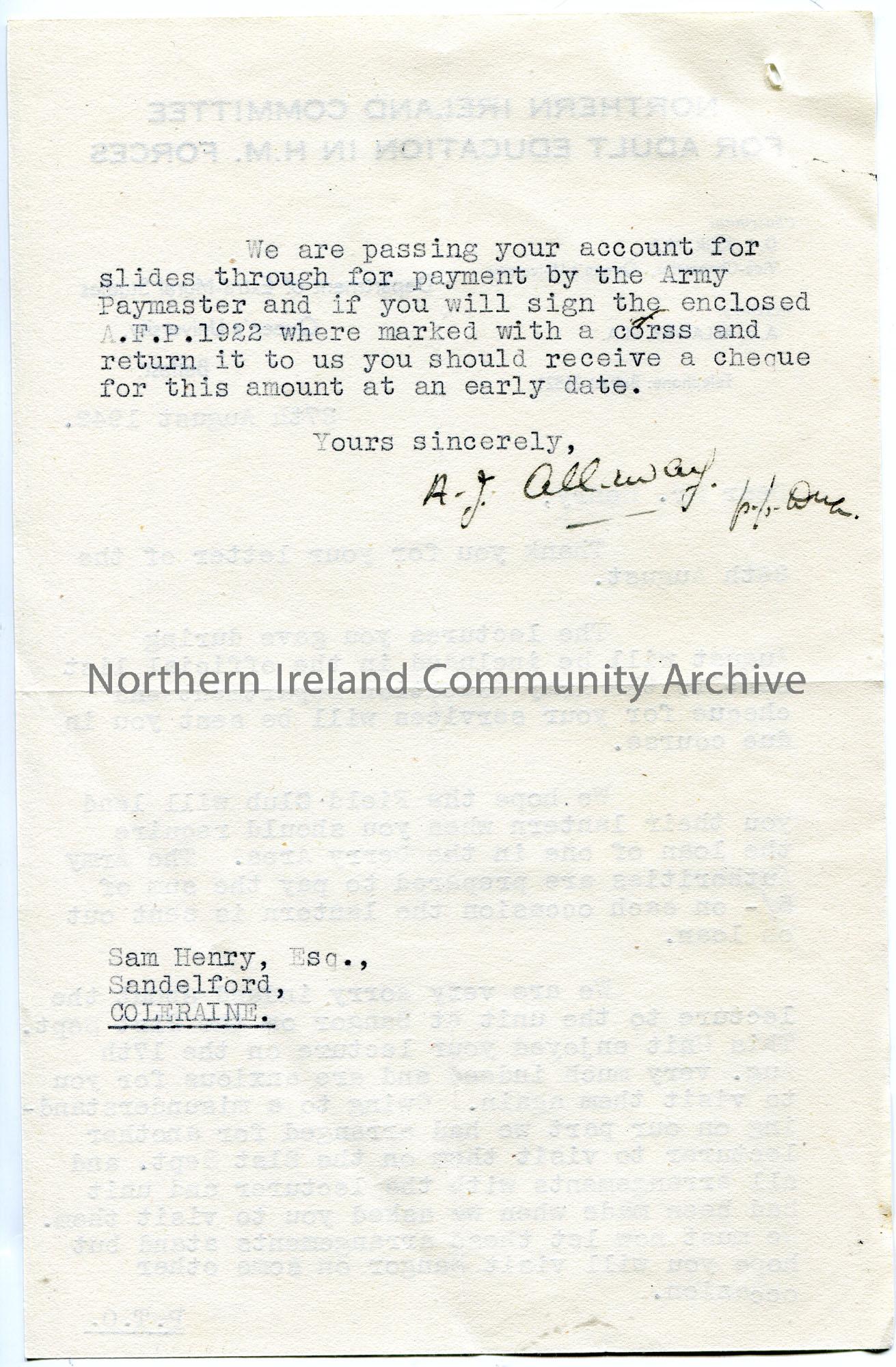 Typed letter (double sided) on headed paper to Sam Henry re lectures to troops. Re payment for lectures and lantern use. Apologises for cancellation of lecture on 21st September 1942 in Bangor. Sam to receive cheque for slides made for the lectures.