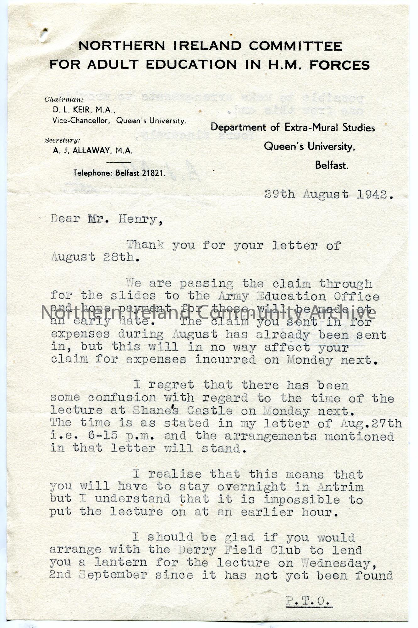 Typed letter (double sided) on headed paper to Sam Henry re lectures to troops. Sam to wait for payment for slides used in lectures. Confirming time of lecture at Shane's Castle as 6:15pm. Sam to arrange lantern from Derry Field Club for lecture on 2nd September 1942.