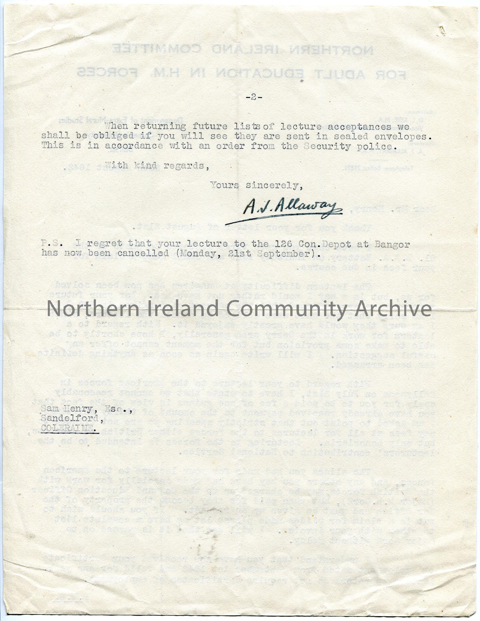 Typed letter (double sided) on headed paper to Sam Henry re lectures to troops. Writing re lantern difficulties at Dungiven. Sam will not be paid a fee for a lecture to American Forces in Ballymena on 31st July. He is told that lecturers to Forces are a lecturer's contribution to National Service. Sam can claim for any slides made for the lectures but they become the property of the War Office. Sam to send further lecture acceptances in a sealed envelope for security reasons.