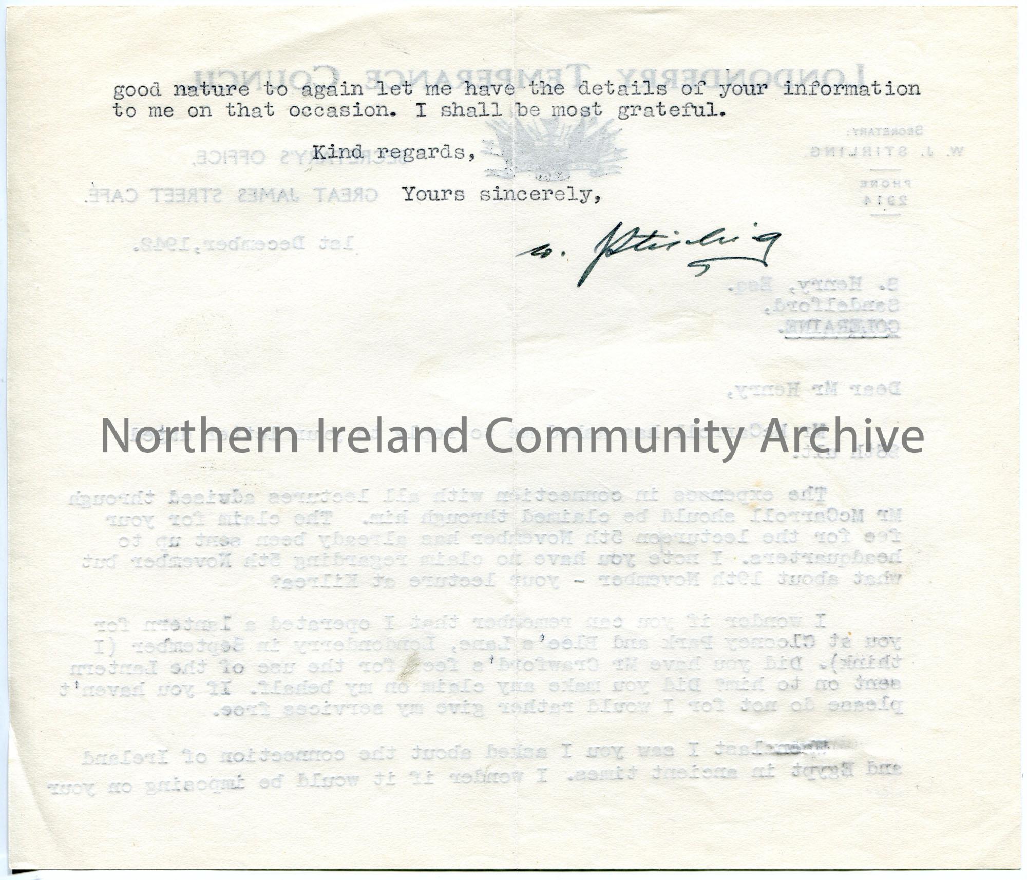 Typed letter (double sided) on headed paper to Sam Henry. Writing re expenses and fees for lectures in Kilrea and Londonderry. Asks Sam if he can send on information re connections between Egypt and Ireland in ancient times.