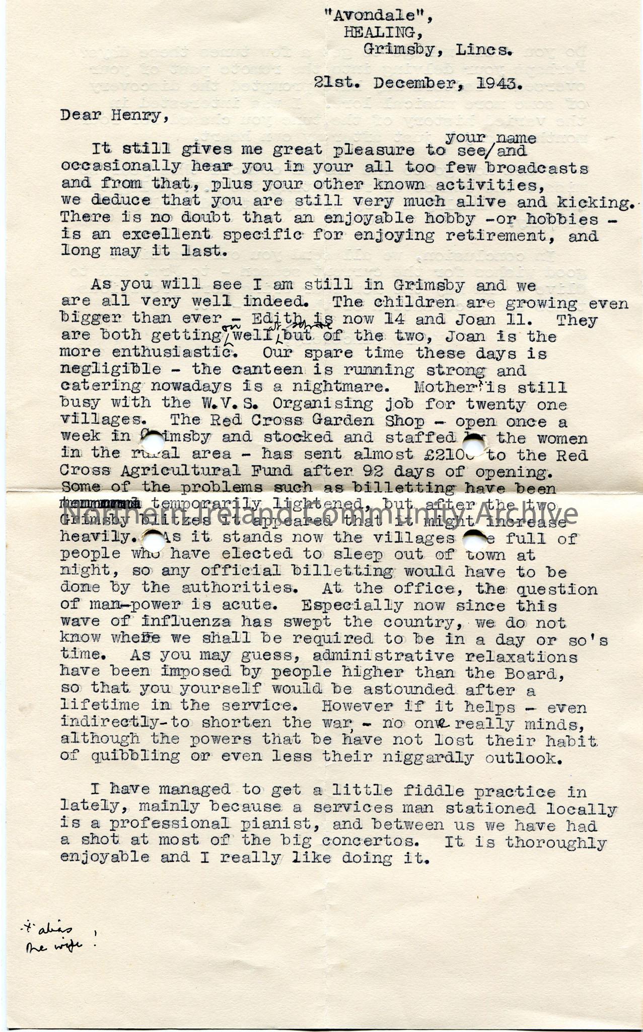 Typed letter (double sided) to 'Henry'. 'X alias the wife!' written in black ink. Small amendments to typed words in black ink. Writes of his two daughters and of running a canteen. Mentions the effects of war on Grimsby - bombing and the raising of funds for the Red Cross. Writes that many people choose to sleep out of town at night. Writes of practising the fiddle. Notes that Sam has overseas visitors. Hopes the blackout ceases in the New Year.