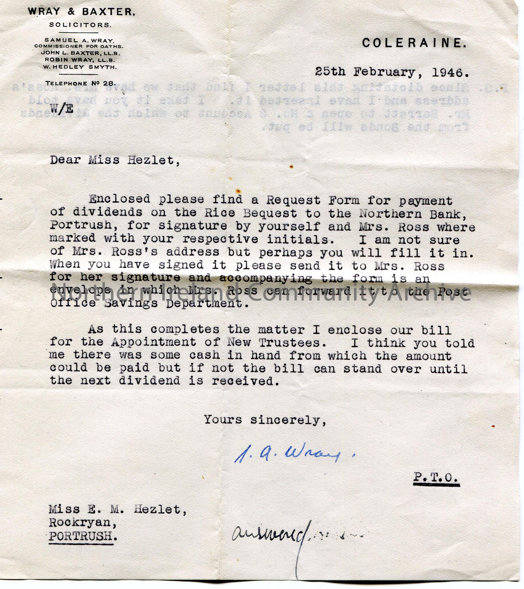 Typed letter, double sided, to Miss E. M. Hezlet at Rockryan, Portrush. Re Rice Bequest. Encloses Request Form for payment of dividends on the Rice Bequest to the Northern Bank for Miss Hezlet and Mrs Ross to sign. Also encloses a bill for the Appointment of New Trustees. Mr Barratt to open a No.2 account for the dividends from the Bonds to be paid into.