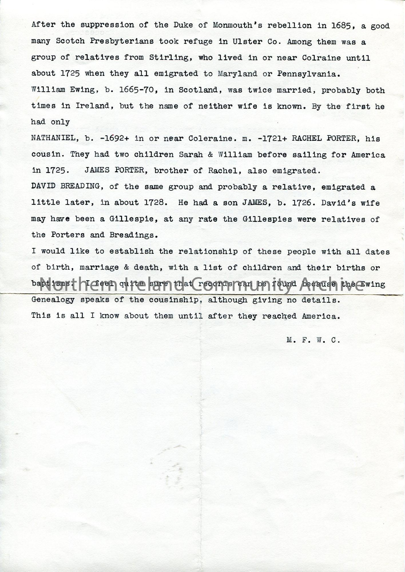 Typed letter (double sided) to Sam Henry. Asks for Sam's assistance re genealogy of the families of the Ewing family. Gives details of emigration of the family members from Ulster, in or near Colraine [Coleraine] to Maryland or Pennsylvania 1725 - 1728. Names mentioned William Ewing, Nathaniel, Rachel Porter, James Porter, David Breading, Gillespie.