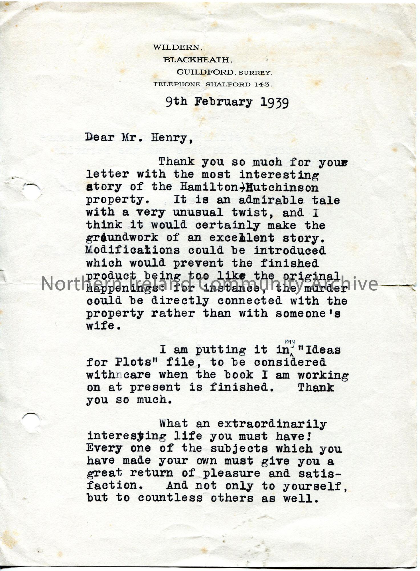 Typed letter (double sided) to Sam Henry. Comments on a story sent by Sam re Hamilton-Hutchinson property. They are also writing a book.