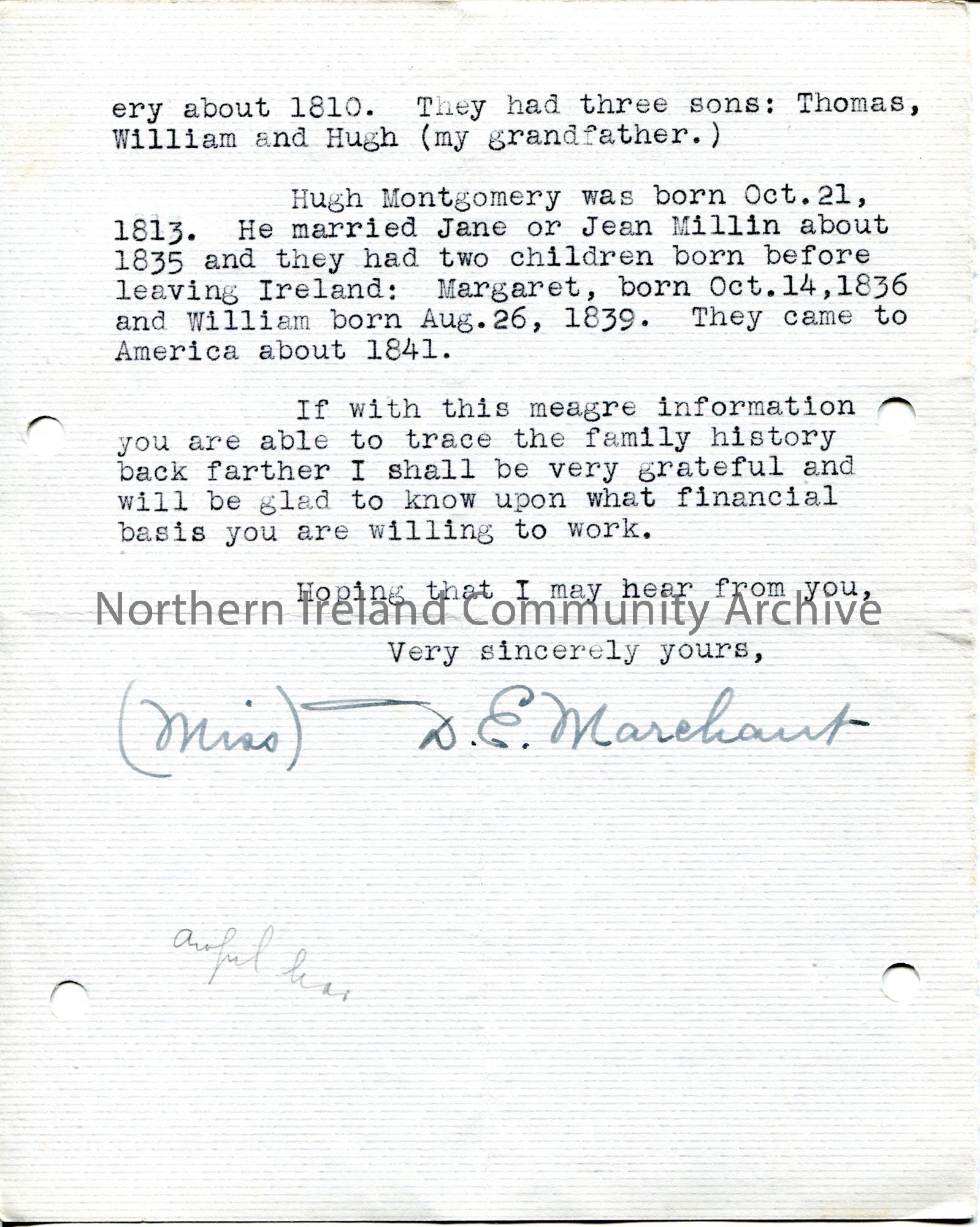Typed letter (double sided) to Sam Henry. Provides Sam with details of ancestors with the name Montgomery. Asks Sam if he can help trace the family tr… – scan127b
