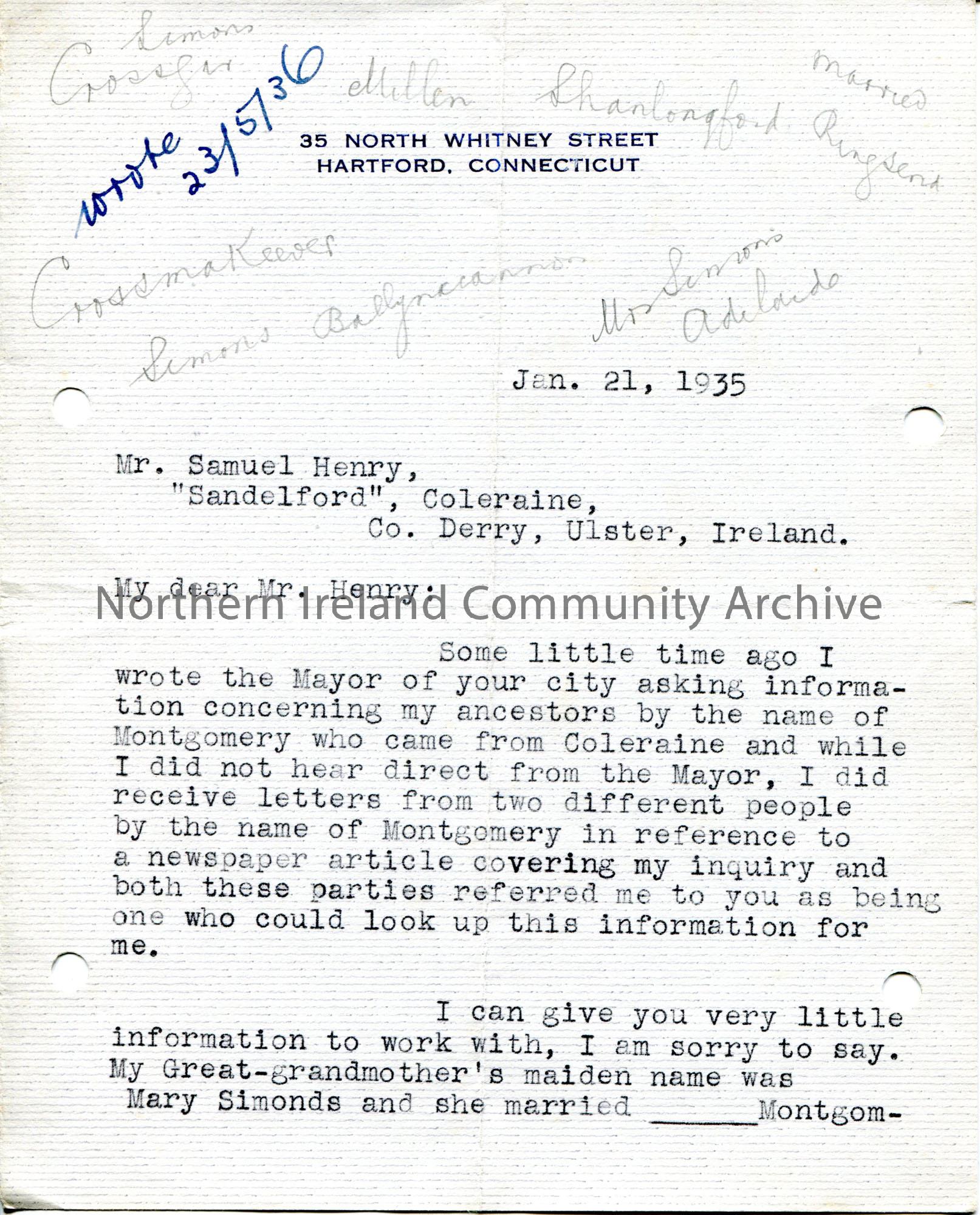 Typed letter (double sided) to Sam Henry. Provides Sam with details of ancestors with the name Montgomery. Asks Sam if he can help trace the family tree back farther. Handwritten words in pencil on front of letter by Sam re surname Simons. Sam replied to letter on 23rd May 1936.