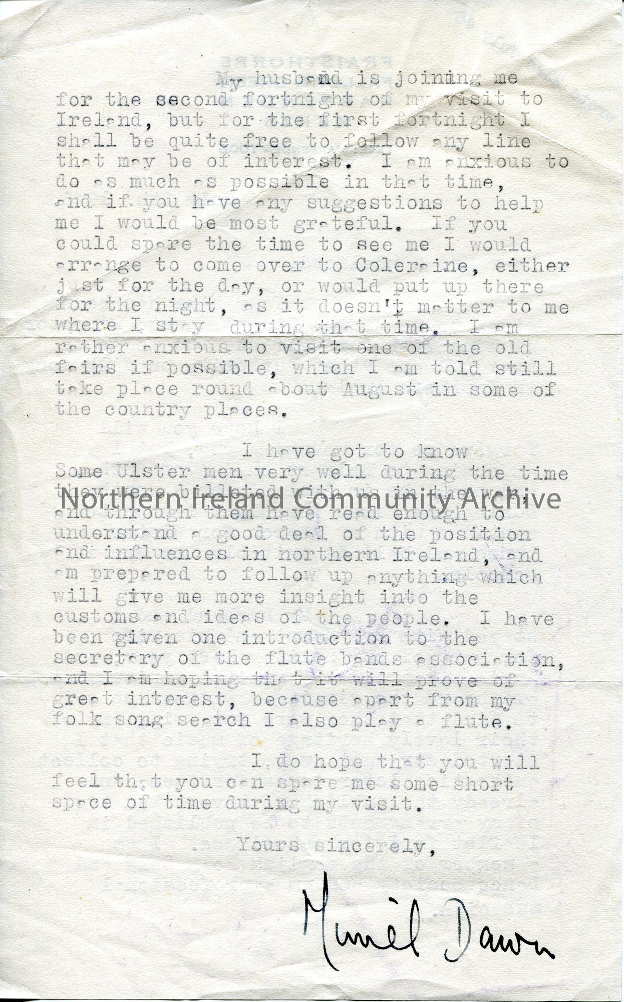 Typed letter (double sided) to Sam Henry. Recommended to Sam via Dr Stuart Hawt, Director of Education for Belfast as "the" authority on folk songs in Northern Ireland. They are to visit Ireland to search for Ulster tunes to use in schools. Hopes to meet with Sam whilst in Ulster. Sam replied on 23rd July as noted in top corner of letter.
