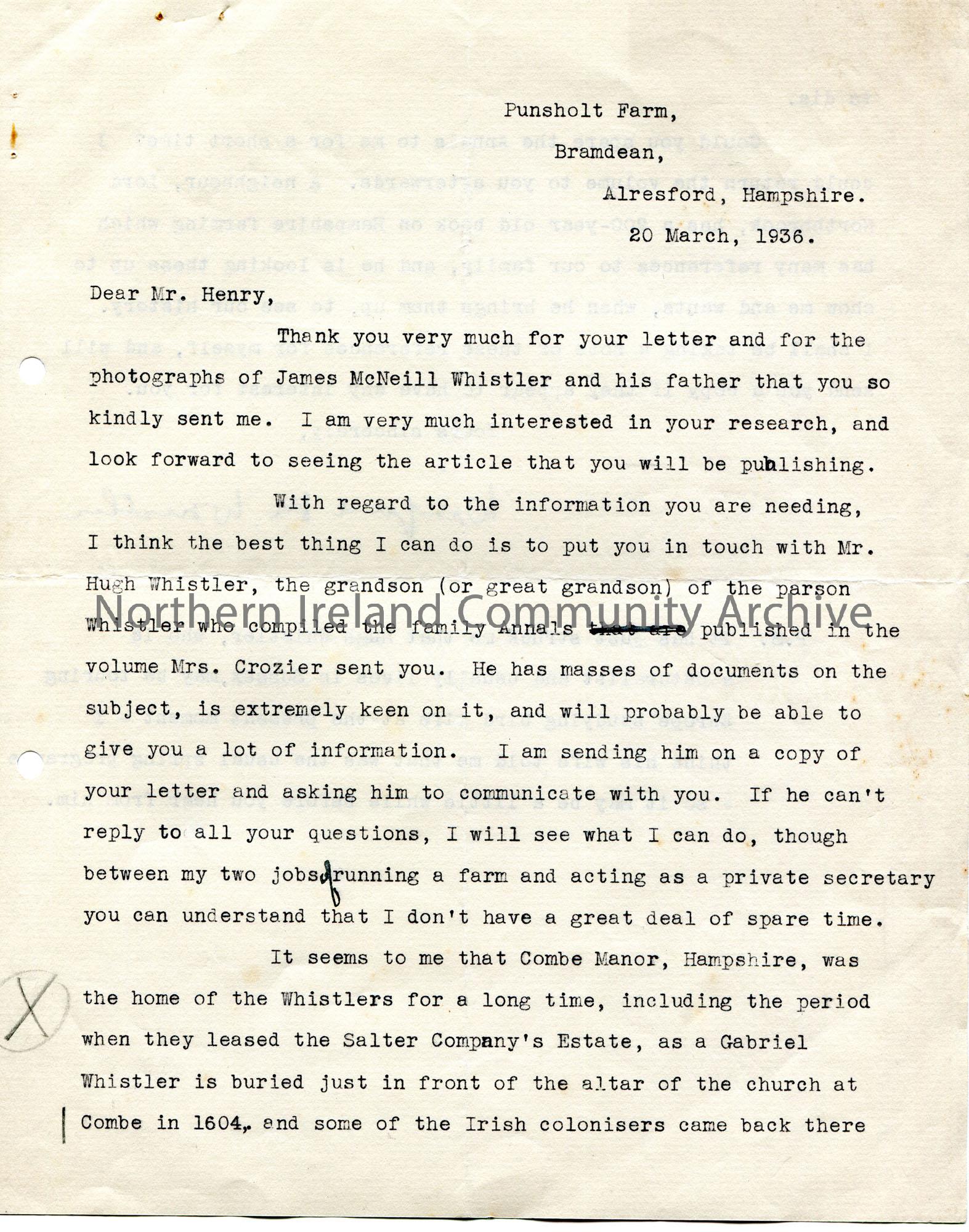 Typed letter (double sided) to Sam Henry. Thanks Sam for letter and photographs of James McNeill Whistler and his father. Sam appears to be writing an article re Whistler. They are to put Sam in touch with Mr Hugh Whistler. Would like to borrow the Annals to reference the Whistler family history.