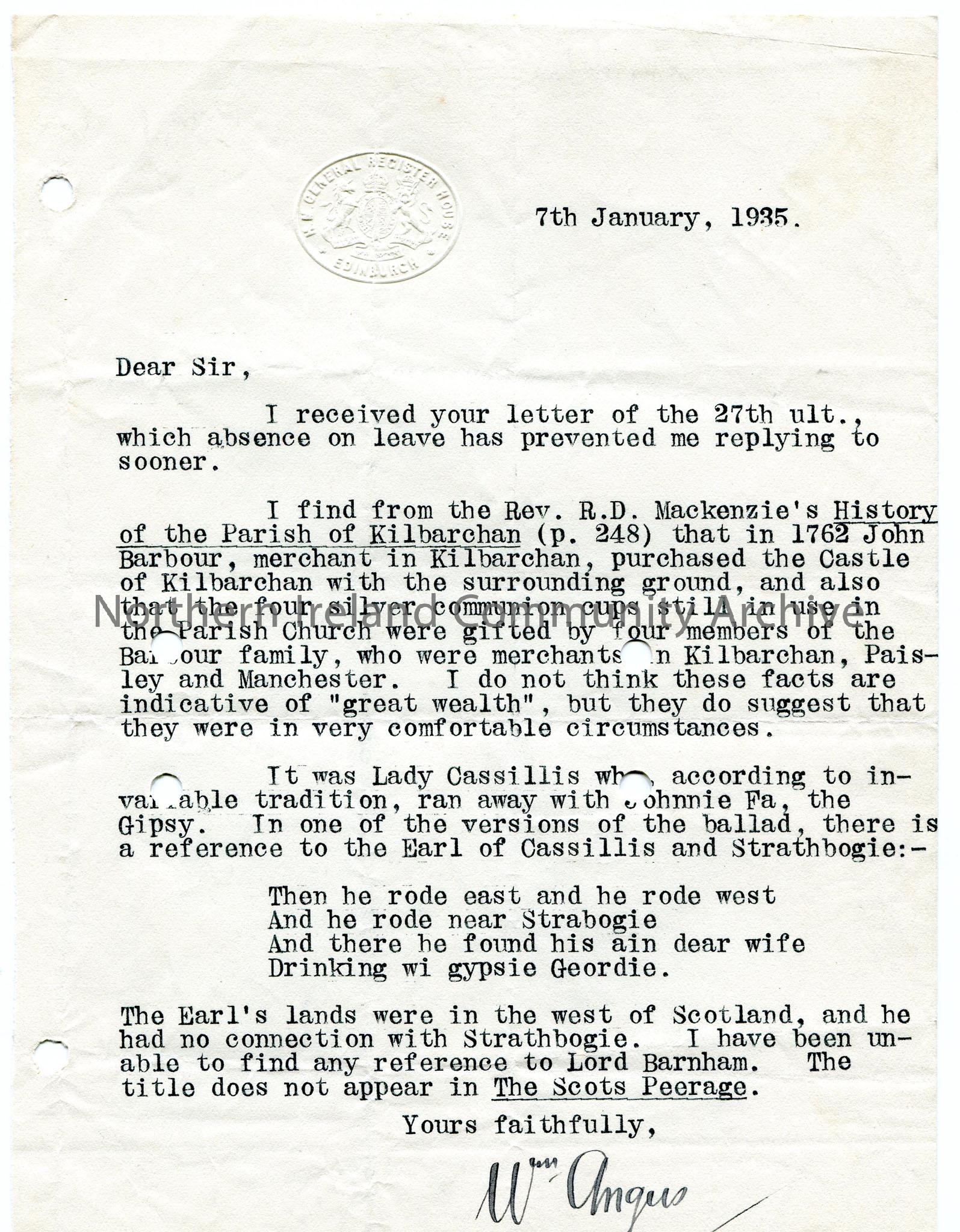Typed letter form General Register House in Edinburgh, answering query by Sam Henry on local history of Kilbarchan parish in Scotland, in relation to a ballad. Words of ballad included - uses local dialect.