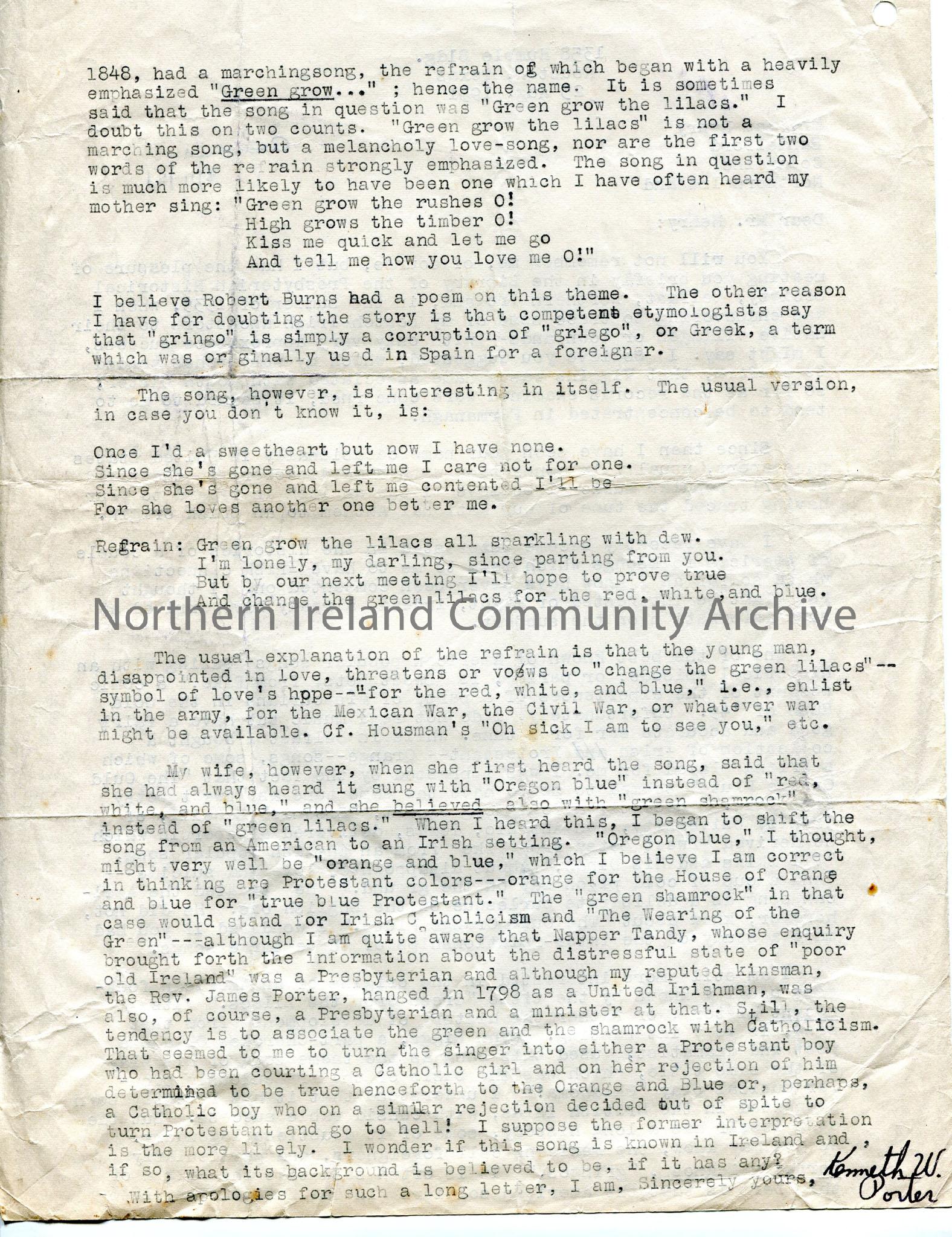 Typed letter from a gentleman who had met Sam in the Library of the Presbyterian Historical Society in Belfast while researching his' Scotch-Irish' ancestors. This gentleman's ancestor had been hanged as a United Irishman. Letter discusses American folk songs, especially 'Green Grow the Lilacs', one version of which is linked to Ireland