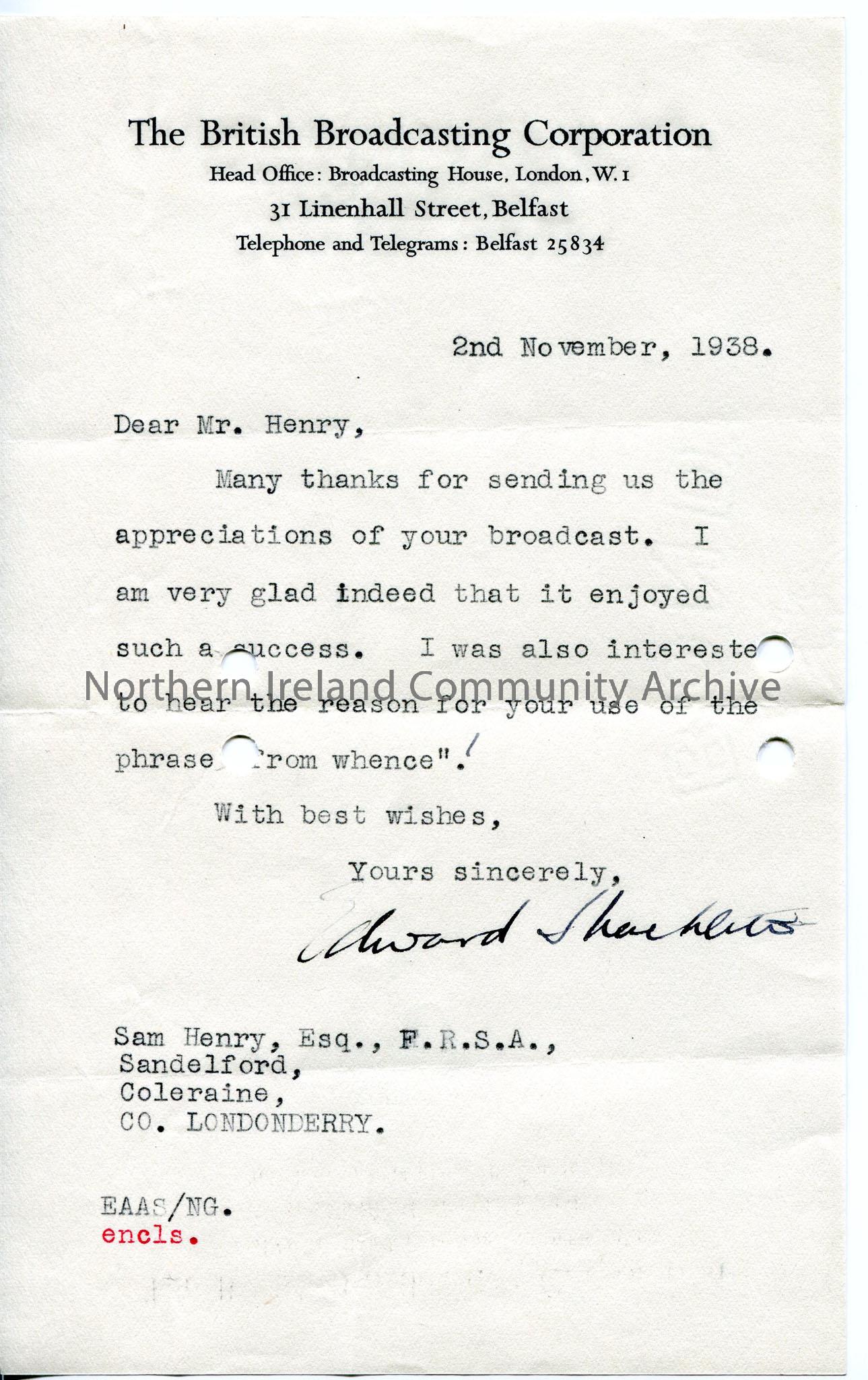 Typed letter from BBC thanking Sam for forwarding appreciations of his broadcast.
