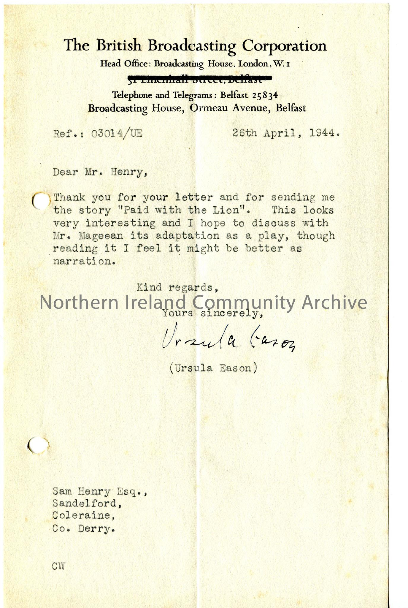 Typed letter from BBC thanking Sam for story sent - potential as a play or narration