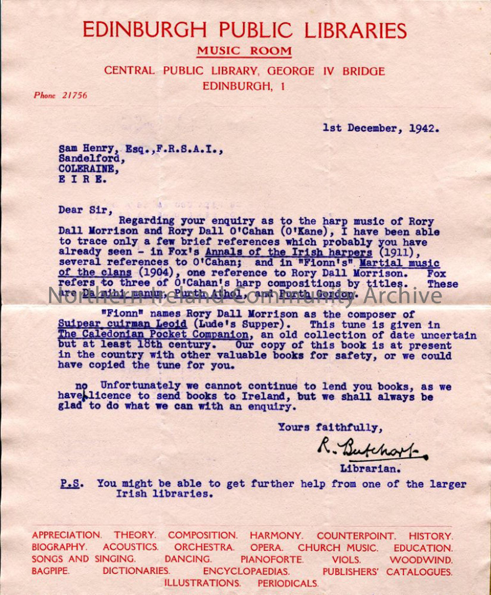 Typed letter from Edinburgh Public Libraries re: harp music of Rory Dall Morrison and Rory Dall O'Cahan. From R Butchort, 1.12.1942.