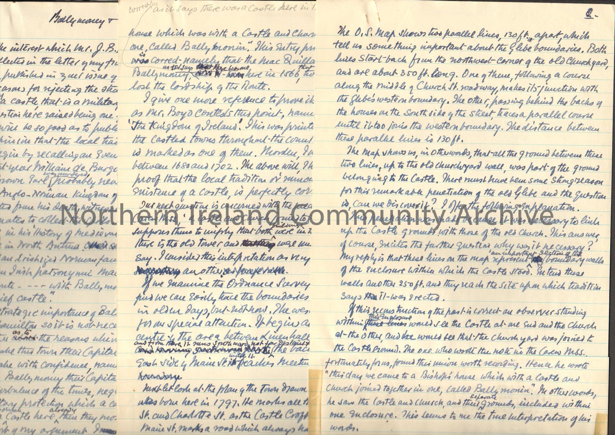 Typed letter from J. Armstrong re Castle in Ballymoney on cream paper. Handwritten version of typed letter on cream blue lined paper in black ink