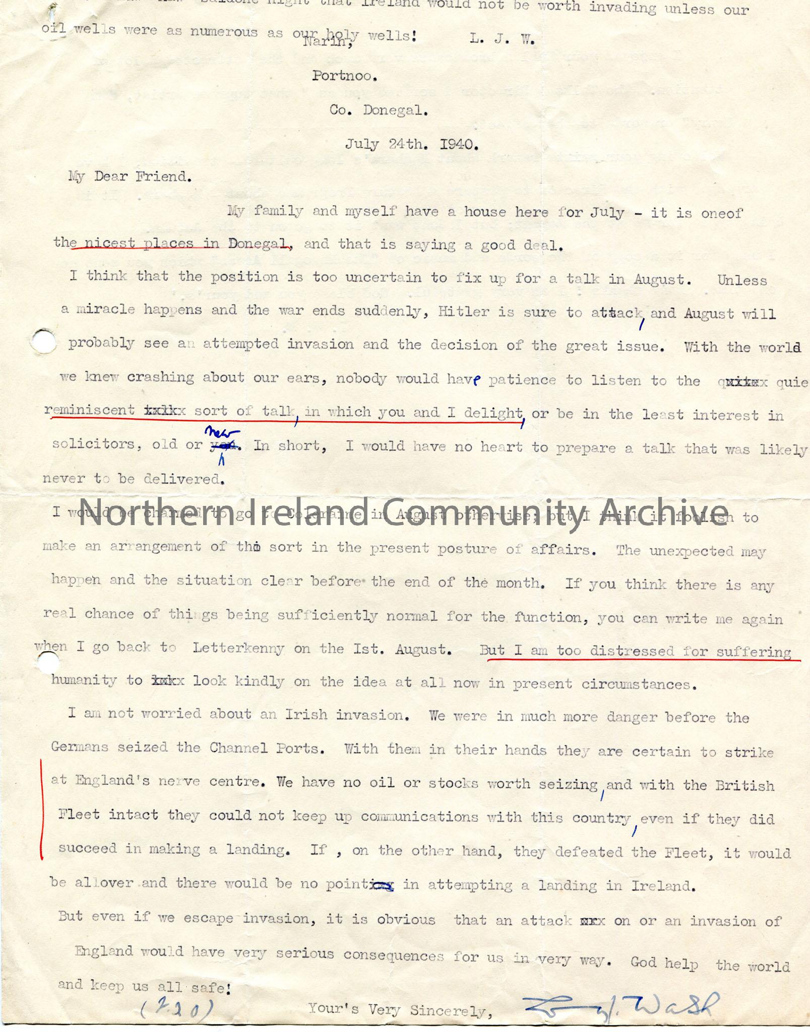 Typed letter from L. J. Walsh. Addressed from Narin, Portnoo, Co. Donegal. Dated July 24th. 1940. He talks of his unwillingness to prepare a talk for August due to a possible invasion by Hitler. He speaks of Ireland during WWII. Talks of a Feature Programme about Maghera.