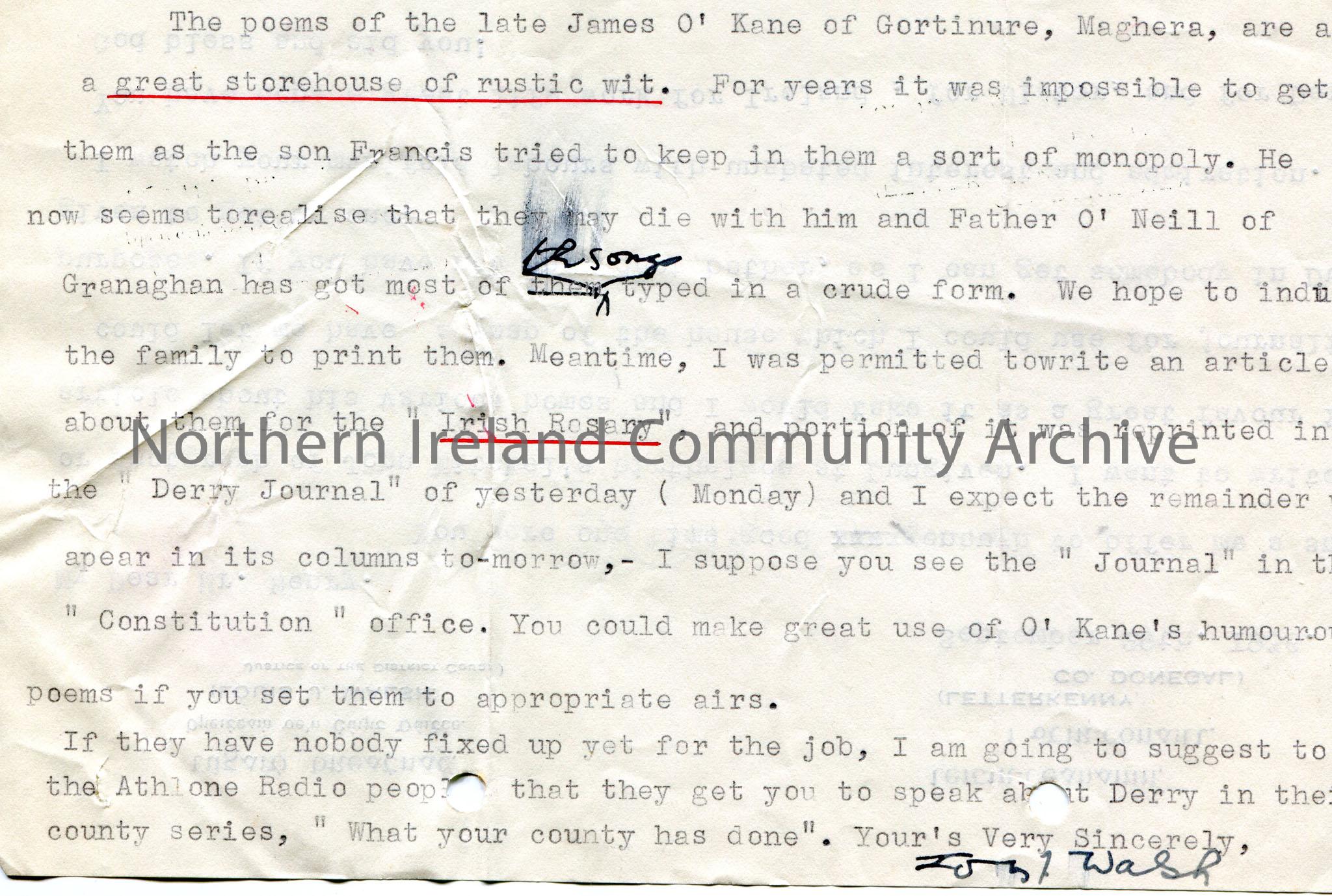 Typed letter from Louis Walsh to Sam Henry. Asks Sam for snap of John Mitchel's birthplace at Dungiven. Refers to the poems of James O'Kane of Gortinure, Maghera and their publication in the "Irish Rosary" and "Derry Journal". Trying to get Sam to talk about Derry on Athlone Radio.