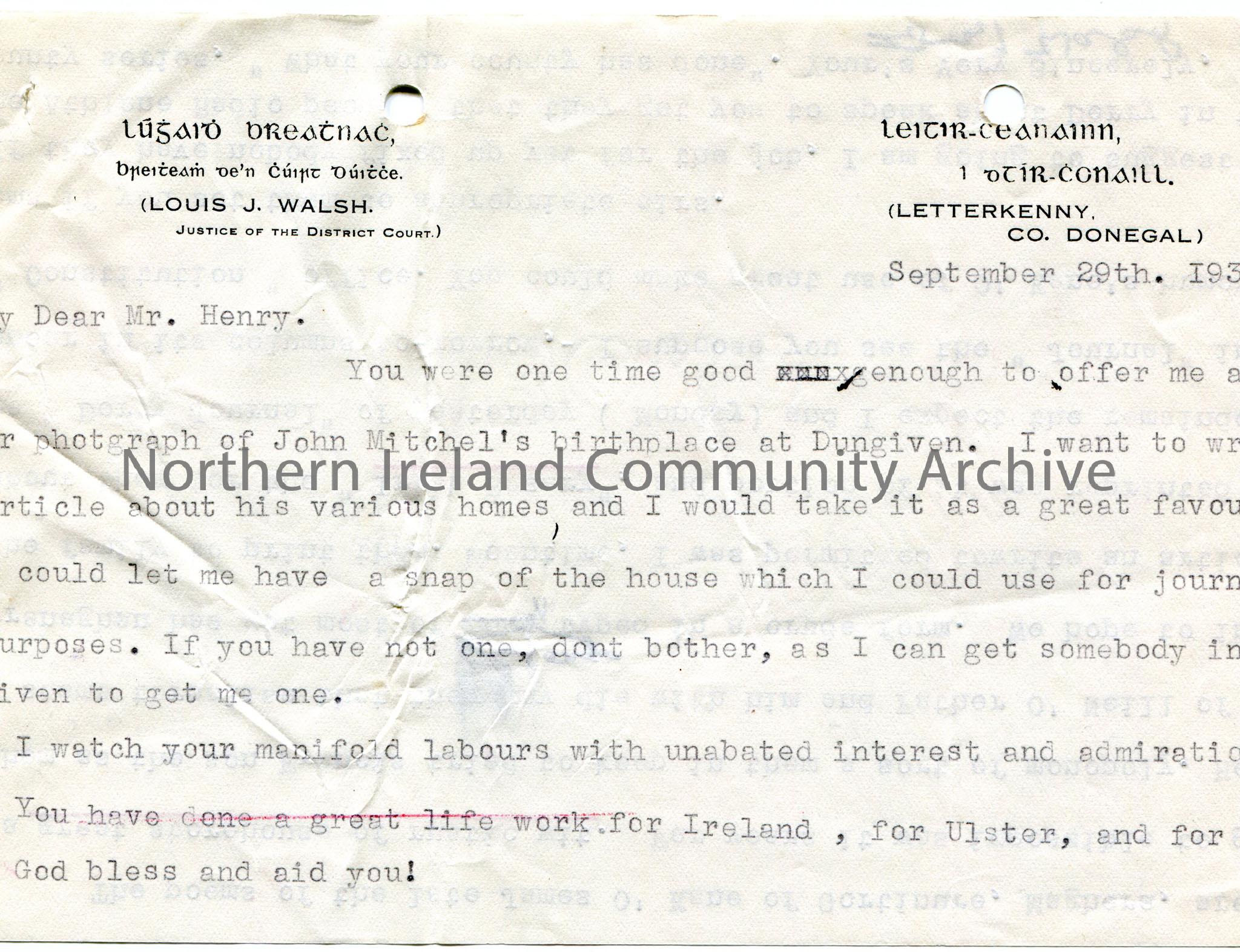 Typed letter from Louis Walsh to Sam Henry. Asks Sam for snap of John Mitchel’s birthplace at Dungiven. Refers to the poems of James O’Kane of Gortinu…