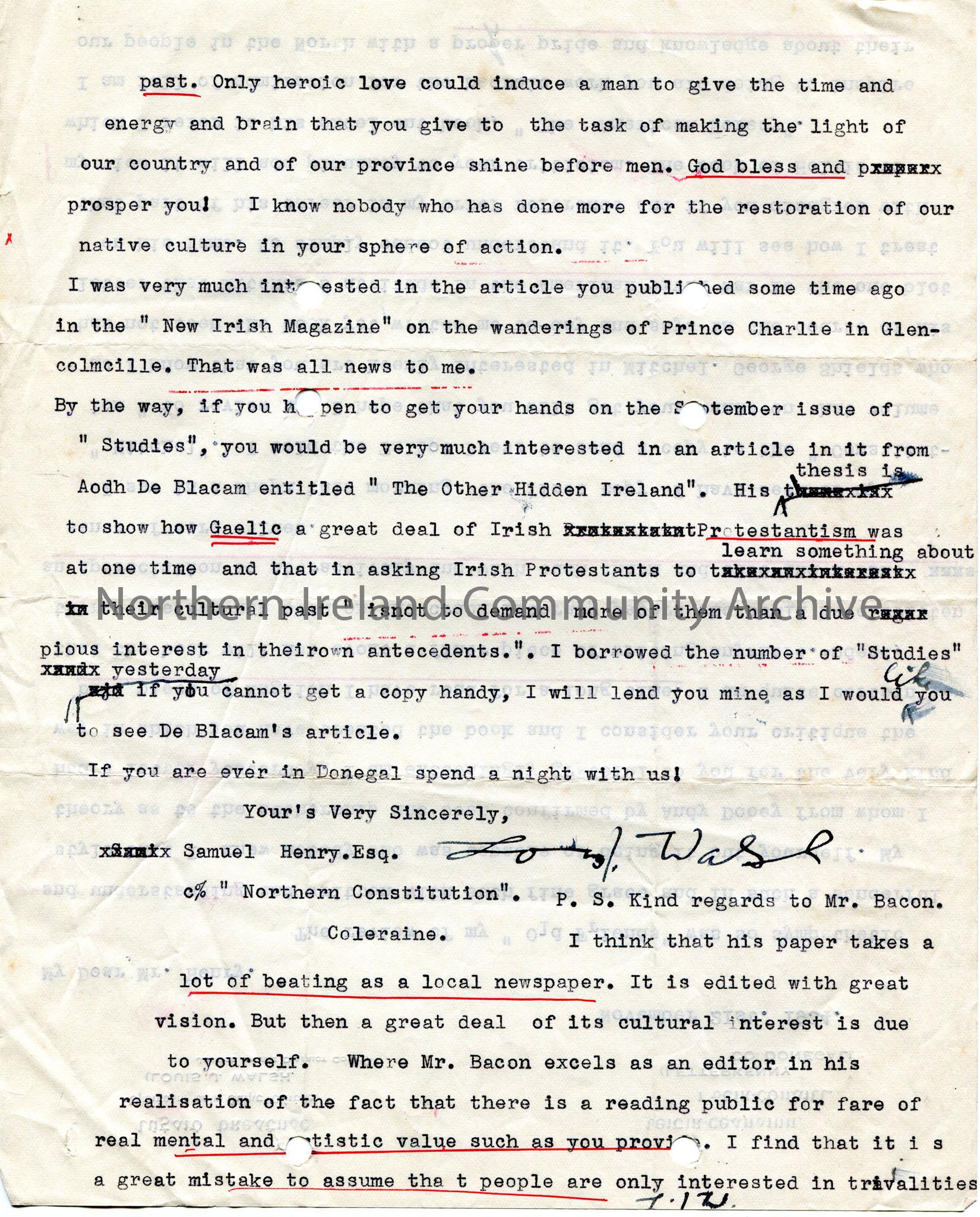 Typed letter from Louis Walsh to Sam Henry. Dated November 21st. 1934. Praises Sam's review of book "Old Friends". Wants Sam to get a copy of his book "Mitchel". Admires Sam for his work and his inspiration for people in the North. Encourages Sam to read an article in "Studies" from Aodh De Blacam "The Other Hidden Ireland". Comments on Mr. Bacon as editor of Northern Constitution.
