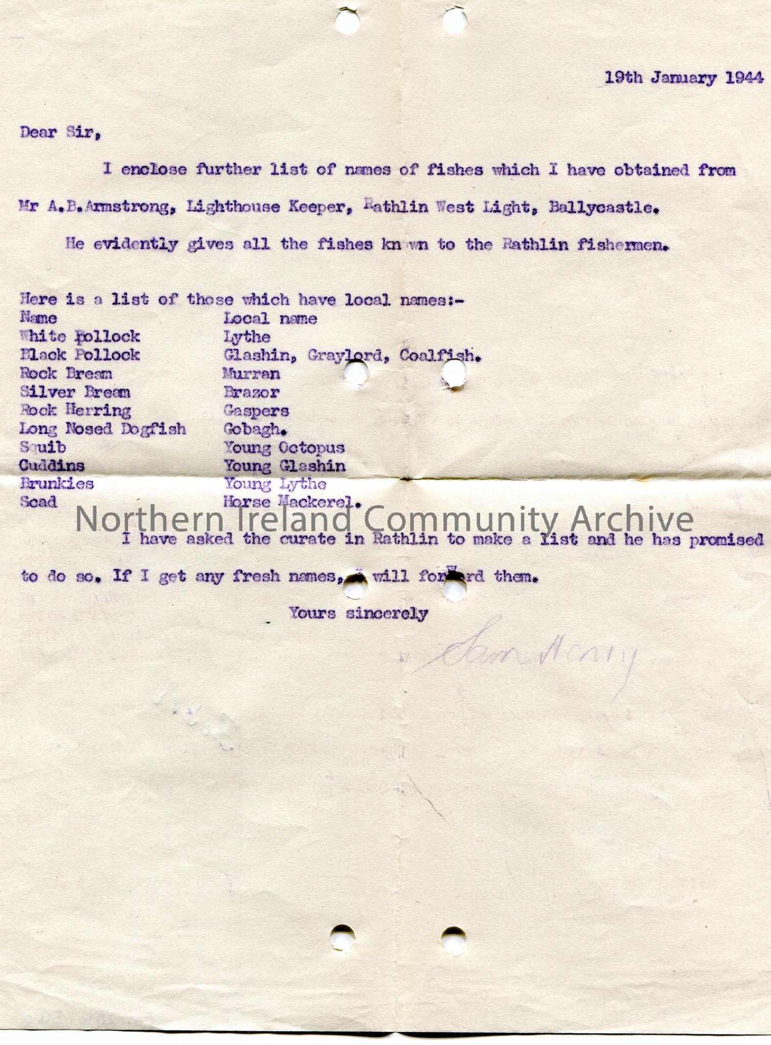 Typed letter from Sam Henry. Dated 19th January, 1944. List of names of fishes obtained from Mr A.B.Armstrong, Lighthouse Keeper, Rathlin West Light, Ballycastle. Gives the name of the fish and its local name. The curate in Rathlin is to make a list.