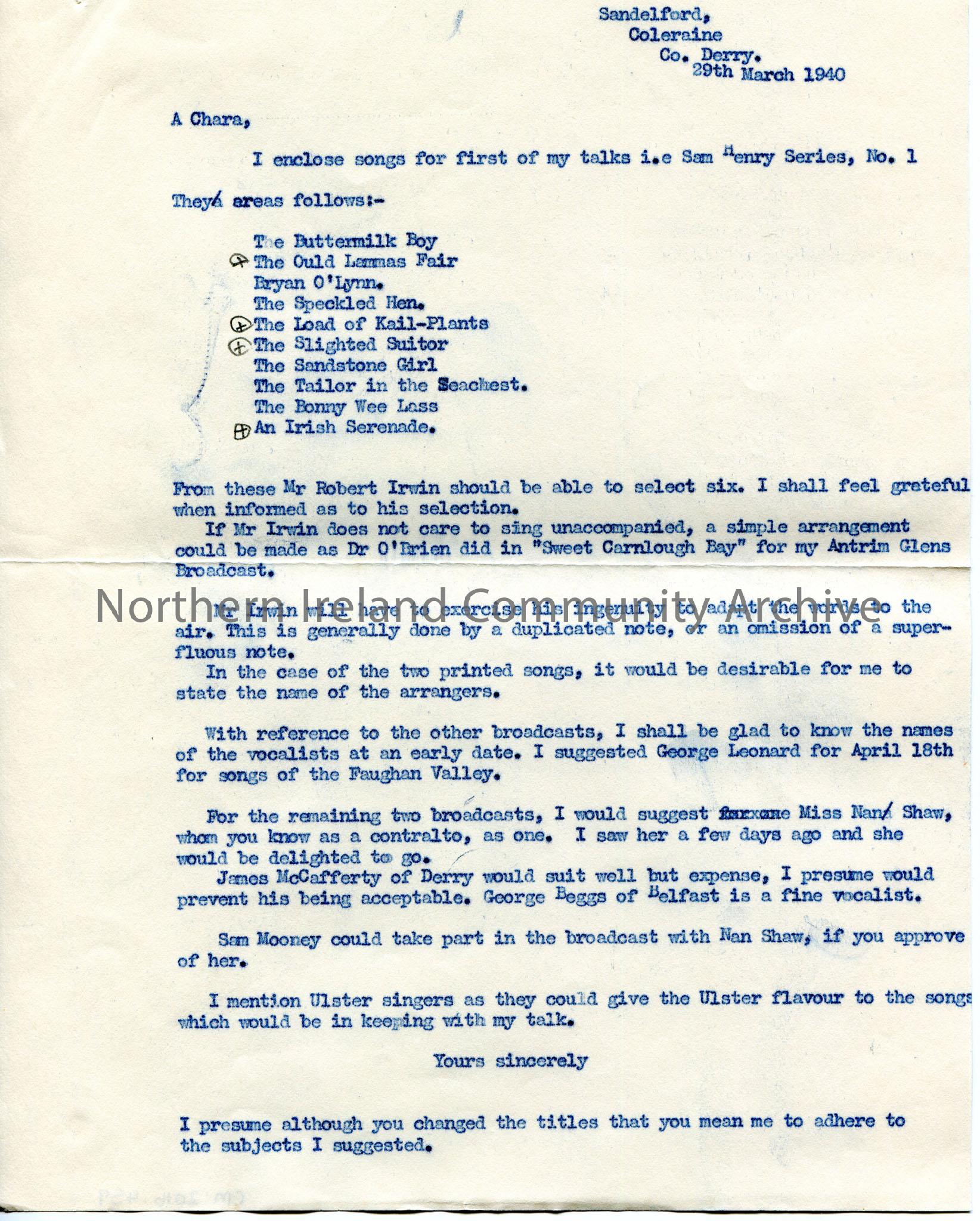 Typed letter from Sam Henry of Sandelford, Coleraine, Co.Derry. Dated 29th March, 1940. Encloses ten songs for his talks- 'Sam Henry Series, No.1', of which six should be selected by Mr Robert Irwin. Suggests singers- Miss Nan Shaw, George Leonard, James McCafferty, George Beggs of Belfast and Sam Mooney.