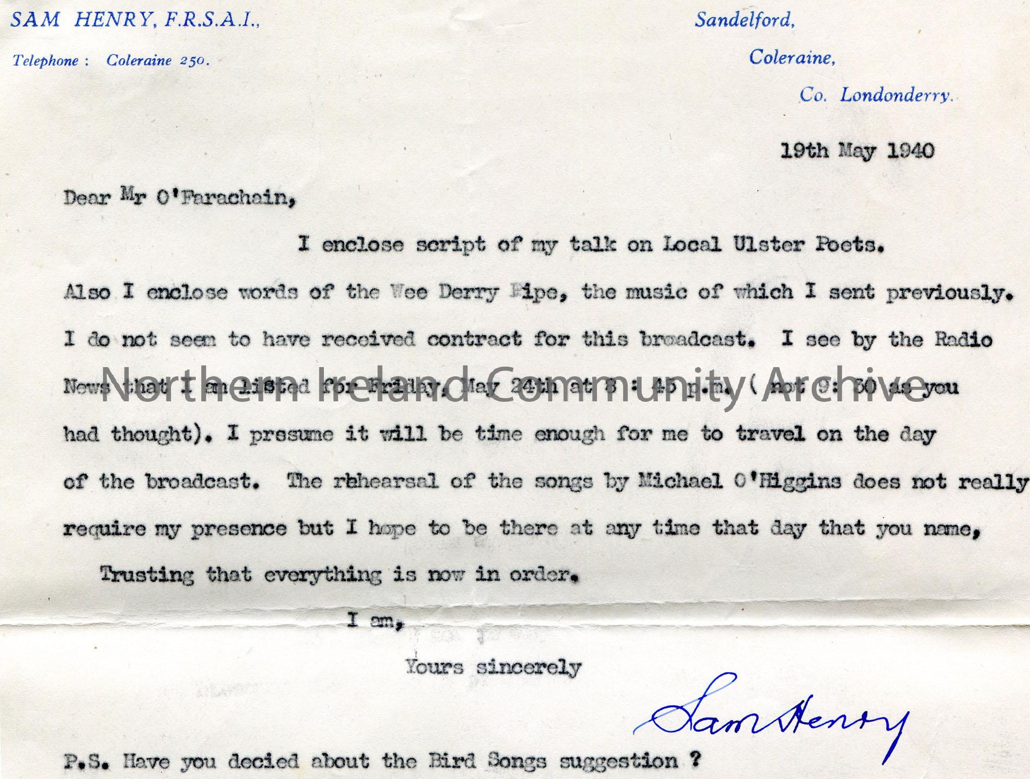 Typed letter from Sam Henry of Sandelford, Coleraine, Co.Londonderry. Dated 19th May, 1940 to Mr O'Farachain. Encloses script of talk on Local Ulster Poets and words of Wee Derry Pipe. Sam querying time for the broadcast on May 24th, 1940. Asks O'Farachain if he has decided re Birds Songs suggestion.