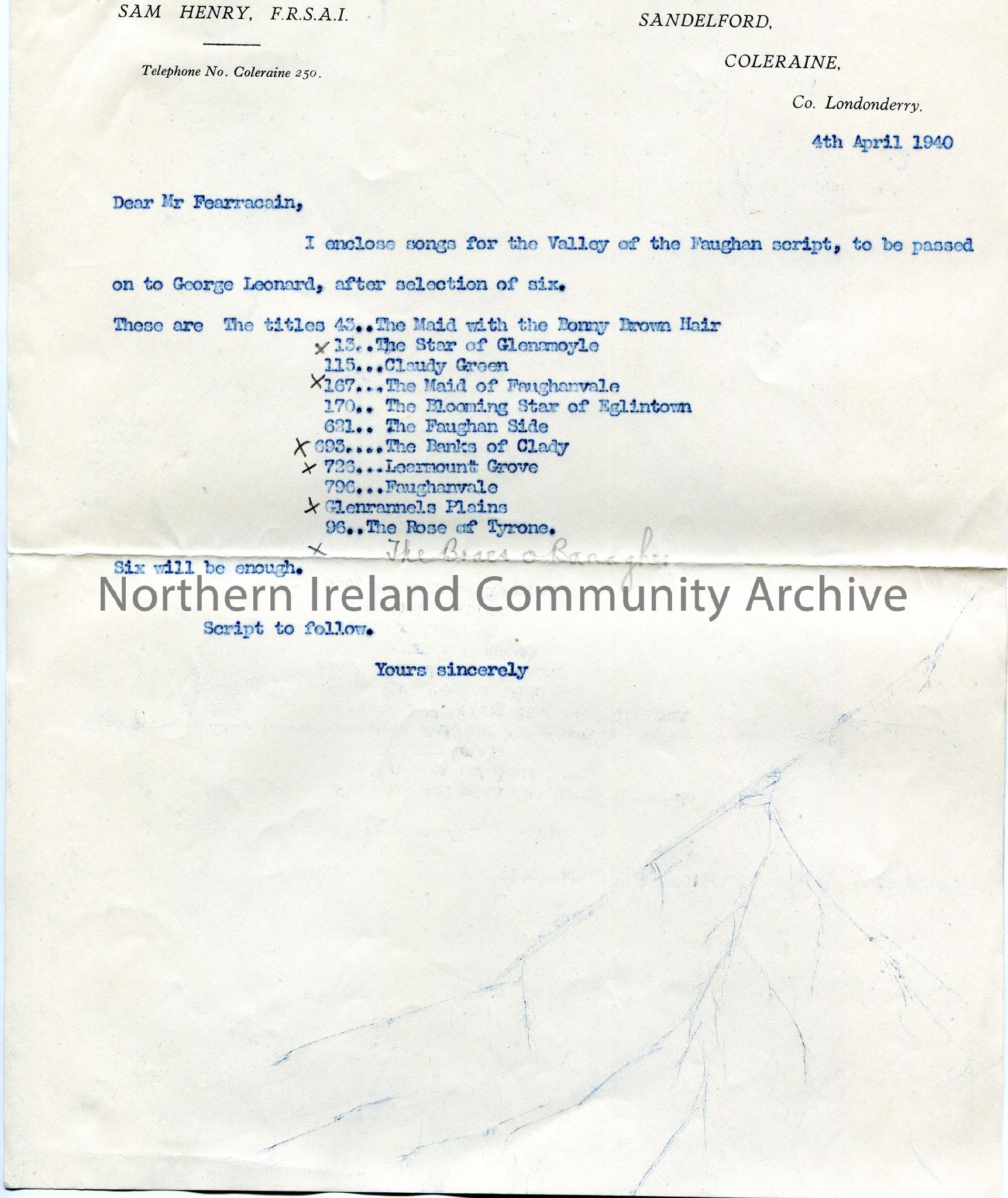 Typed letter from Sam Henry of Sandelford, Coleraine, Co.Londonderry to Mr Fearracain. Dated 4th April, 1940. Encloses songs for the Valley of the Faughan script to be passed on to George Leonard. Six songs to be selected.
