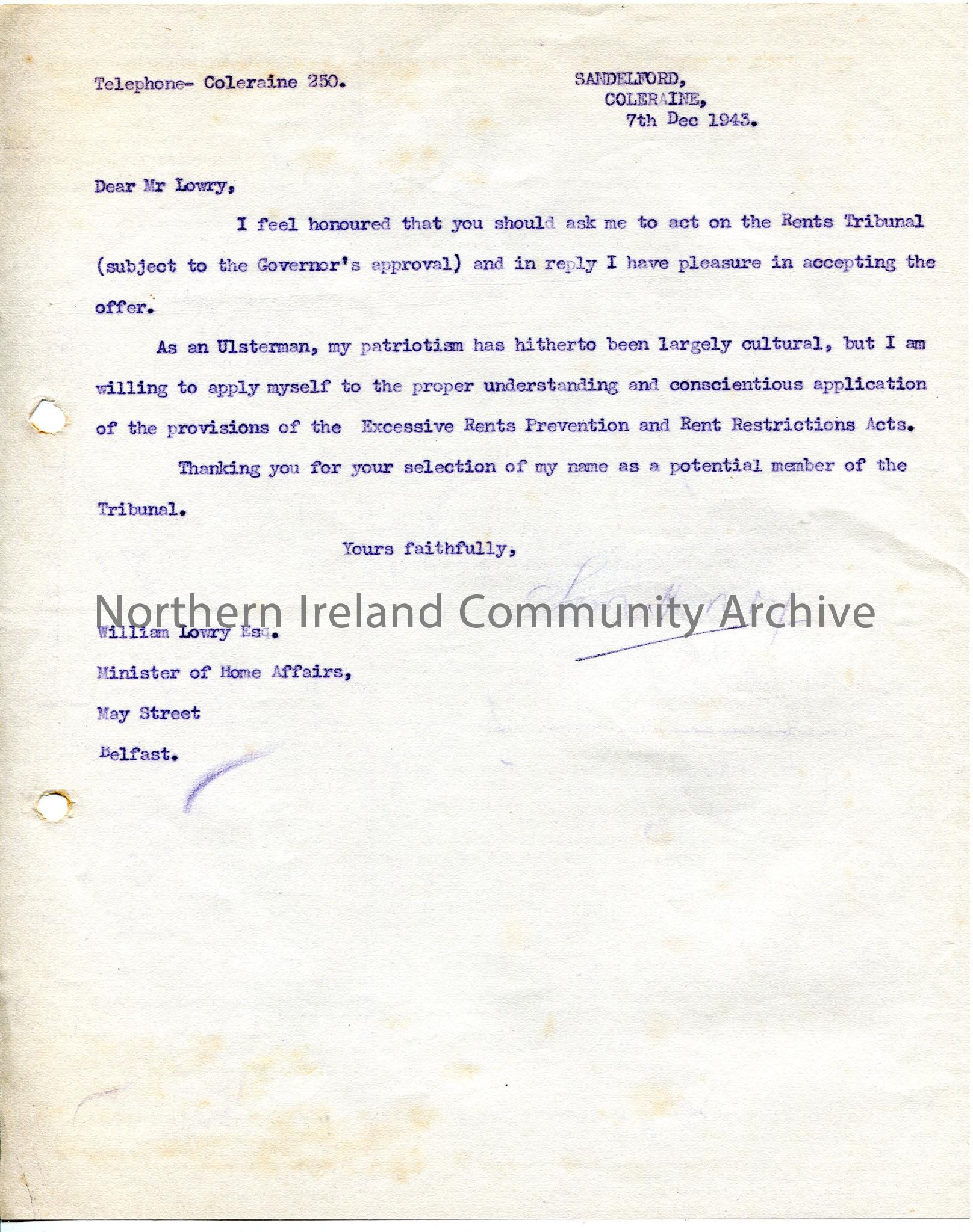 Typed letter from Sam Henry thanking William Lowry for asking him to act on Rent’s Tribunal