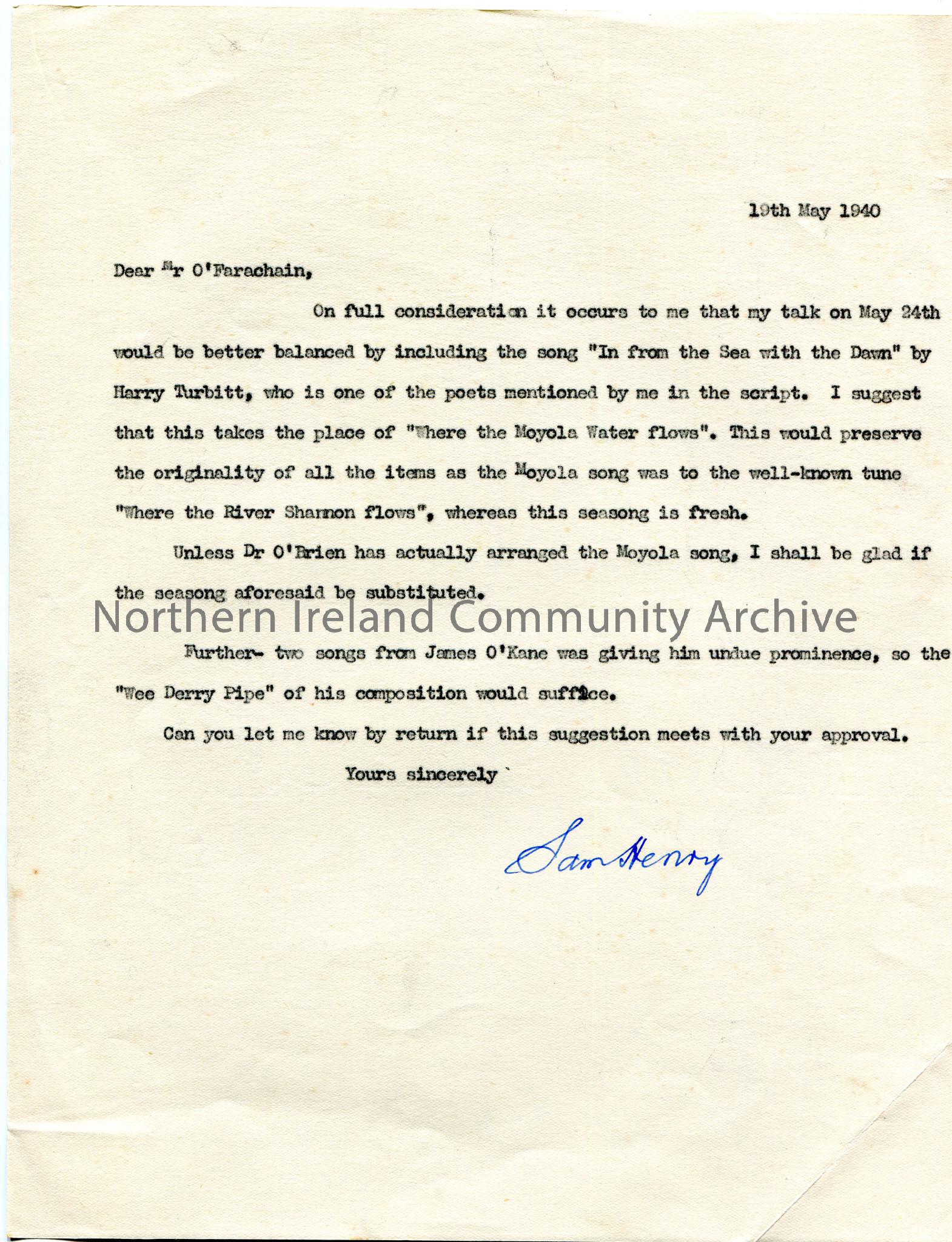 Typed letter from Sam Henry to Mr O’Farachain. Dated 19th May, 1940. Sam wishes to switch songs for talk on 24th May to include “In from the Sea with …