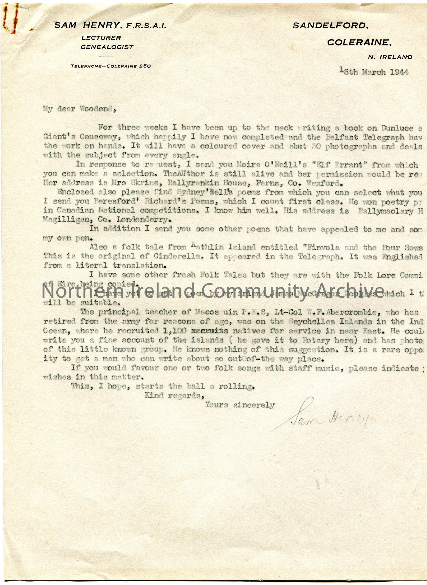 Typed letter from Sam Henry. Words partly cut off on right side. Addressed from Sandelford, Coleraine. Dated 18th March, 1944. Writing to Mr Woodend. Sam has completed a book on the Giant's Causeway and Dunluce which is with the Belfast Telegraph. It has a coloured cover and 30 photographs. Encloses Moira O'Neill's "Elf Errant" and Sydney Bell's poems. He also sends Beresford' Richard's poems who lived at Ballymaclary House, Magilligan, Co.Londonderry. Also includes a folk tale "Finvola and the Four Sows" which is the original of Cinderella and appeared in the telegraph. Refers to principle of Macosquin P.E.S, Lt-Col W.F.Abercrombie who could have an account of his time in the Seychelles with photographs.