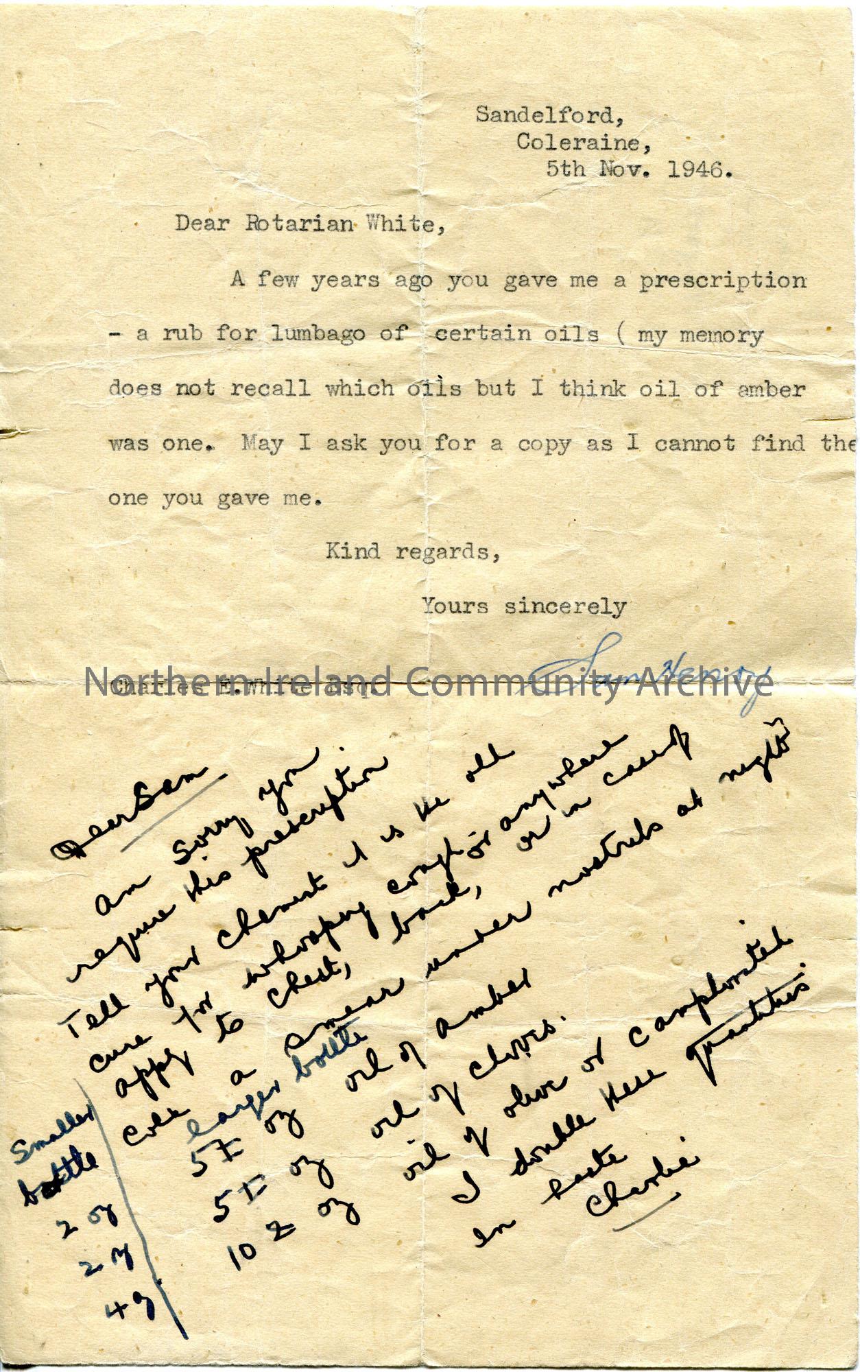 Typed letter from Sam to Charles E. White with Charles' reply handwritten on the same letter. Sam addresses Charles as 'Rotarian White'. He asks for the name of certain oils used in previous treatment for his lumbago. In reply, Charles tells Sam to inform his chemist it is a cure for whooping cough. He lists the oils used. 'Sarah Graham write Mrs Smyth' handwritten on reverse in pencil.