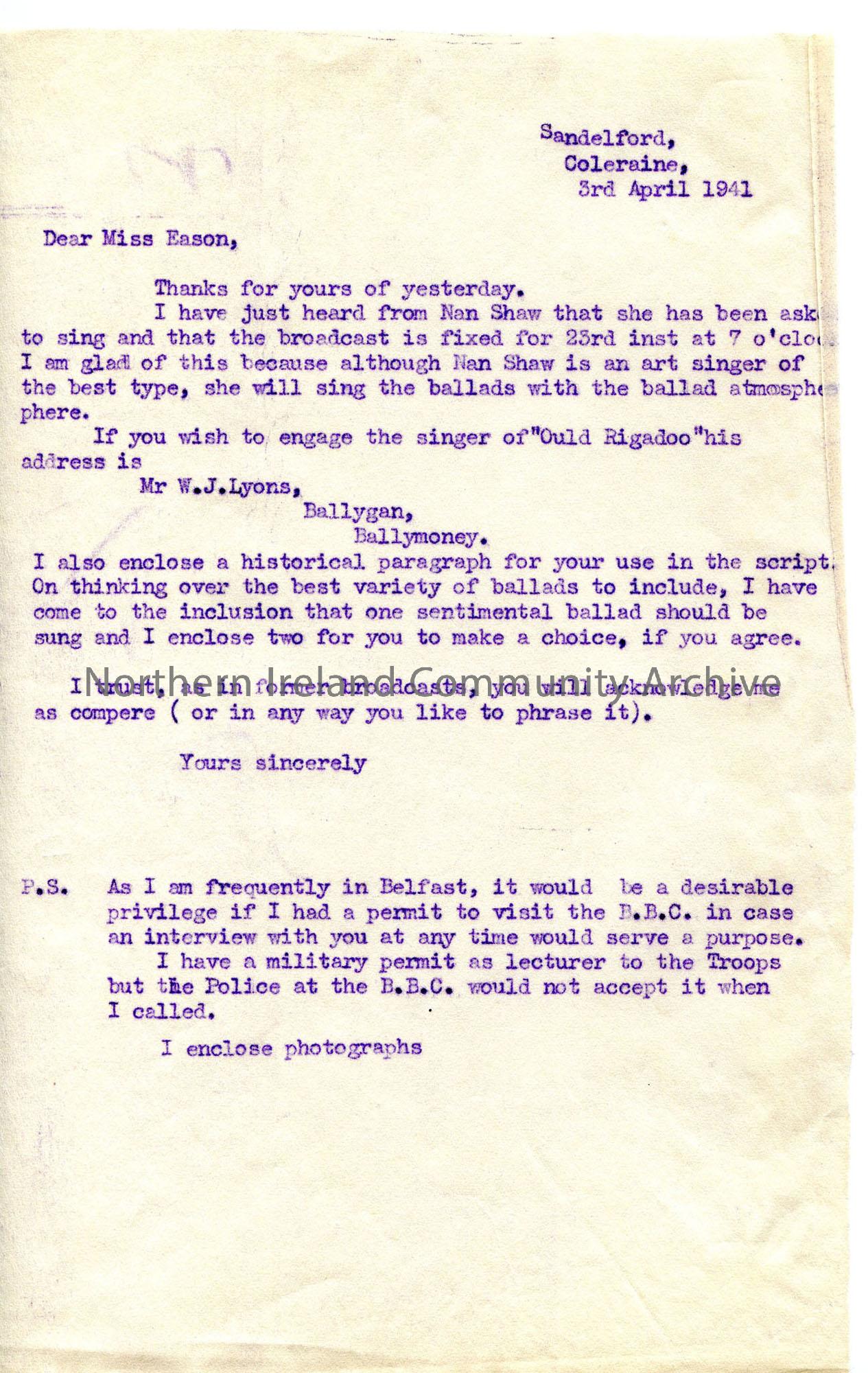 Typed letter from Sam to Ursula Eason at BBC – pleased that Nan Shaw will be singing ballads. Has military permit for troop lectures but BBC police wo…