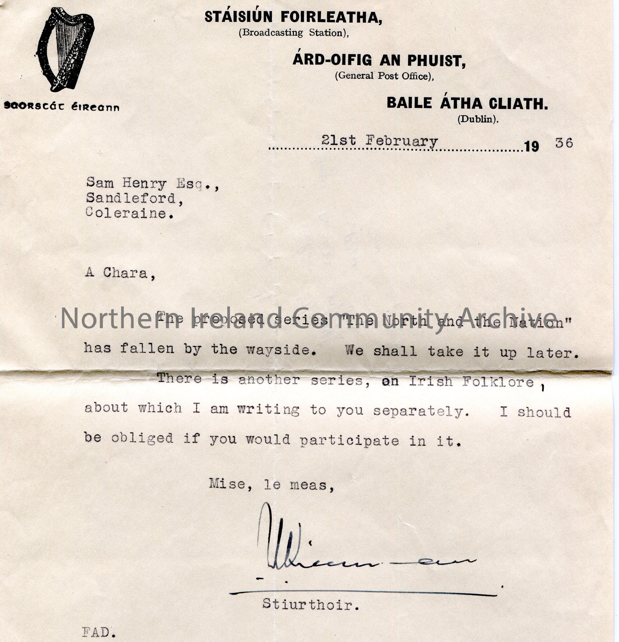 Typed letter from the Broadcasting Station, General Post Office, Dublin. Dated 21st February, 1936. Writing to let Sam know the series “The North and …