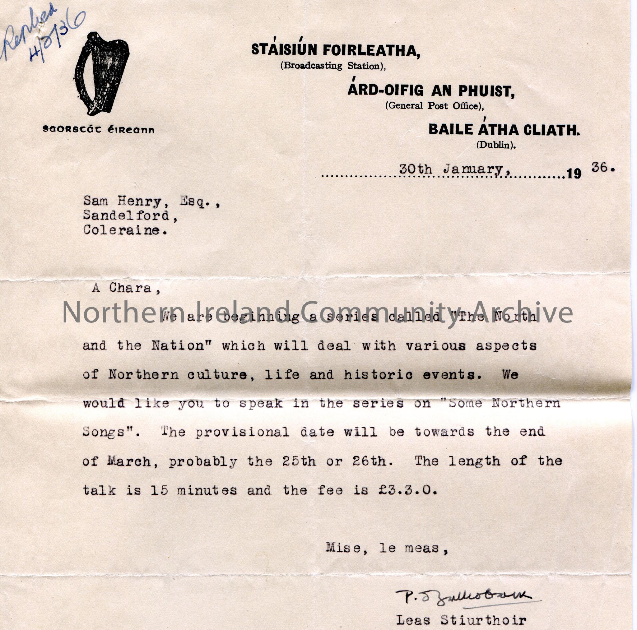 Typed letter from the Broadcasting Station, General Post Office, Dublin. Dated 30th January, 1936. Asks Sam if he would like to speak in the series "Some Northern Songs" for "The North and the Nation" series, with a provisional date of 25th or 26th March for 15 minutes for a fee of £3.3.0. 'Replied 4.2.36' written in ink top left of letter.