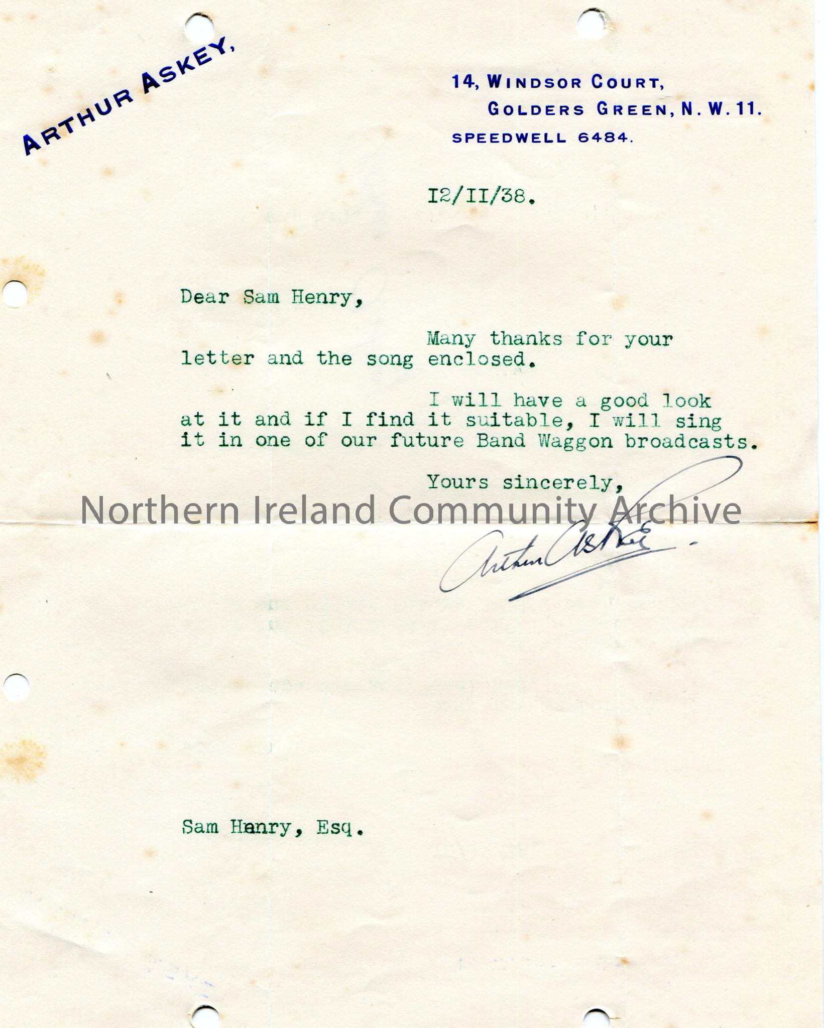 Typed letter in green ink. From Arthur Askey. Addressed from 14 Windsor Court, Golders Green, N. W. 11. Dated 12th November, 1938. Thanks Sam for the letter and song. The song, if suitable, will be sung by Arthur Askey in a future Band Waggon broadcast.