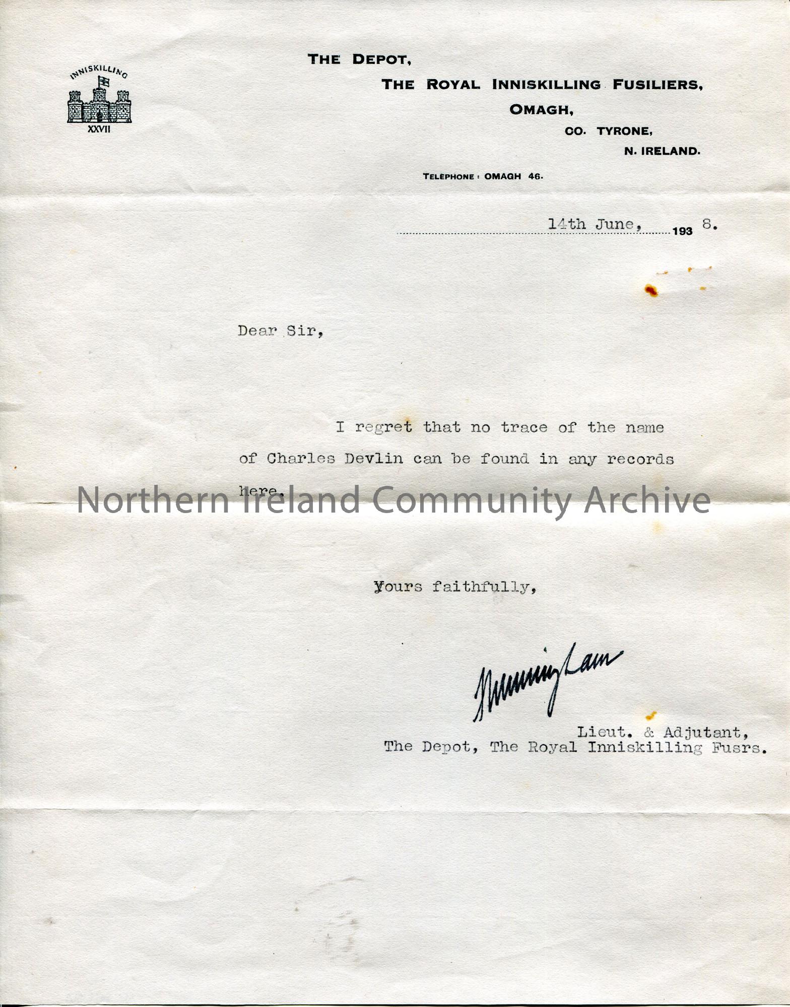Typed letter informing Sam that there was no result for the name Charles Devlin in the records.