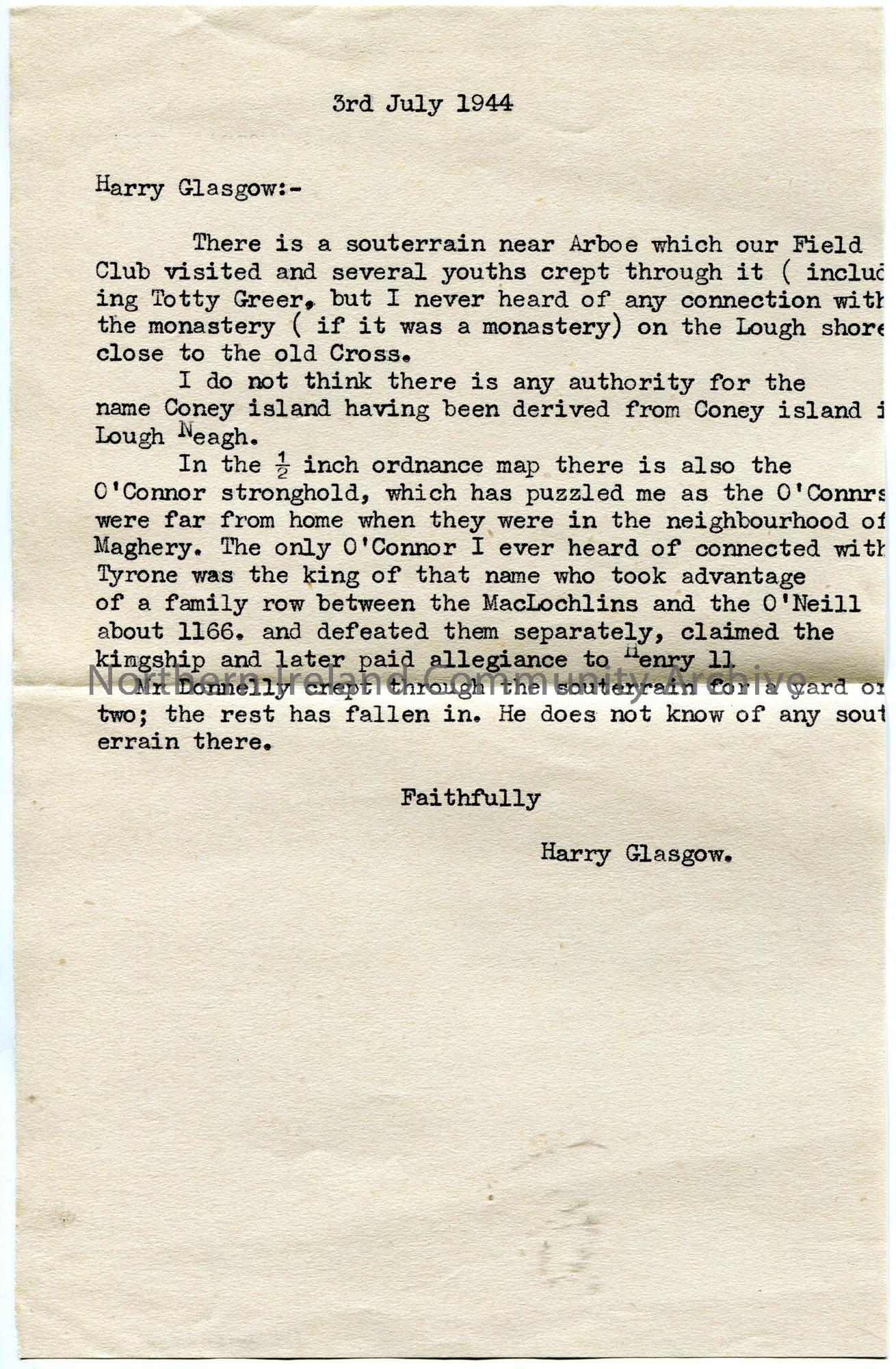 Typed letter (not the original). Most likely to Sam Henry which he has typed out. Mentions Totty Greer, the origin of Coney island's name and the O'Connor stronghold.
