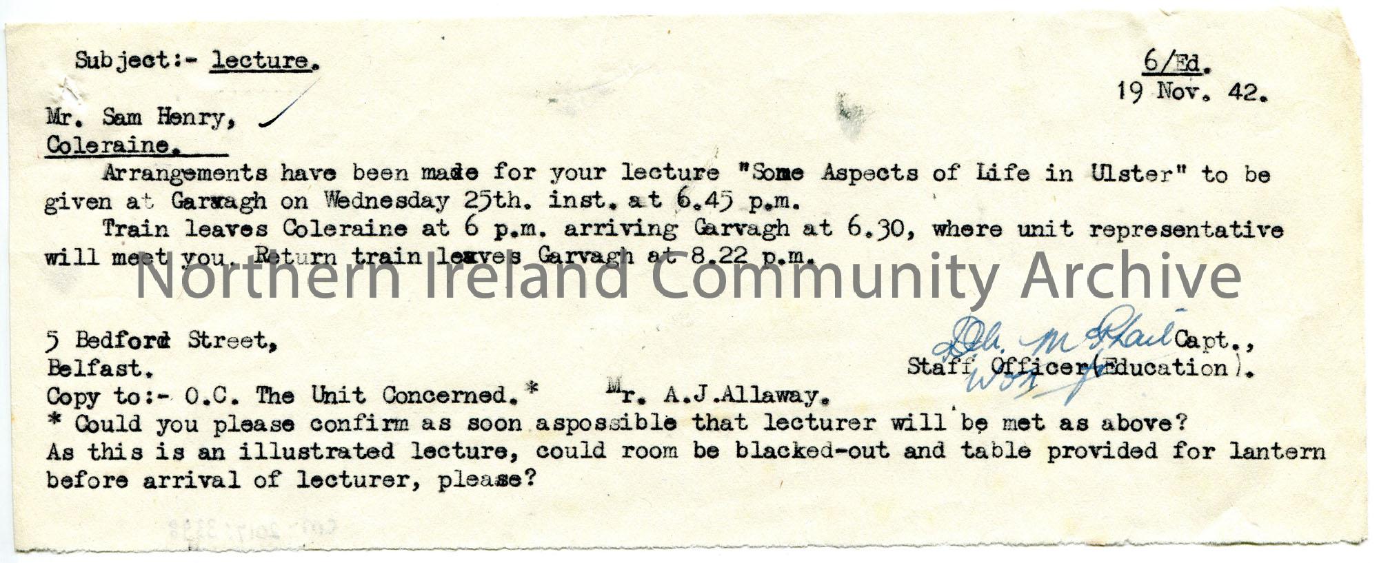 Typed letter on a strip of paper to Sam Henry. Confirming arrangements for Sam's lecture on 'Some Aspects of Life in Ulster' in Garvagh on 25th November 1942. Confirms travel arrangements.